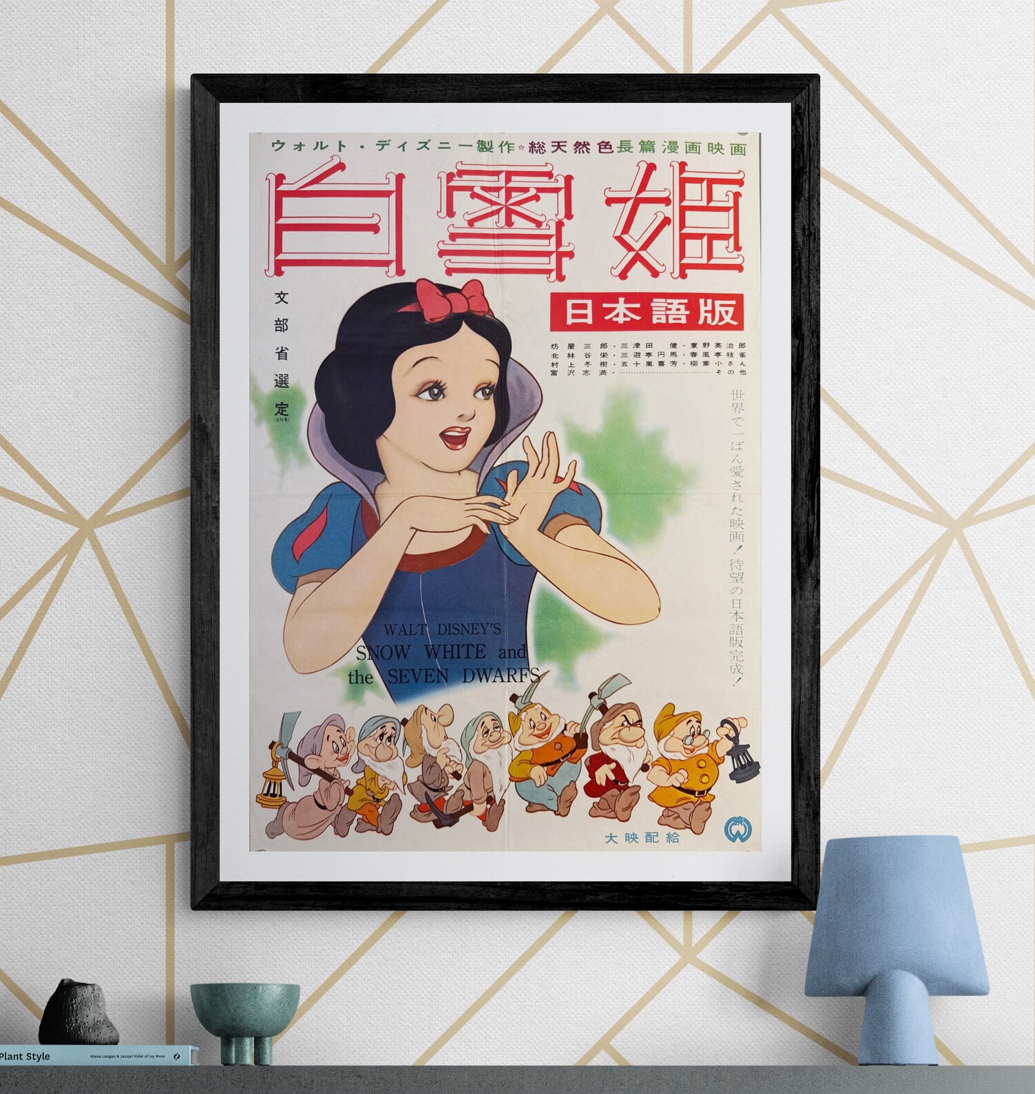 A superb 1958 Japanese re‑release B2 for Disney’s Snow White and the Seven Dwarfs, issued for the film’s Japanese “日本語版” (Japanese‑language version) campaign. Visually, it is a masterclass in Japanese poster economy: a clean pale ground, monumental vermilion title characters, and a radiant Snow White portrait—finished with the beloved marching dwarfs along the bottom edge.