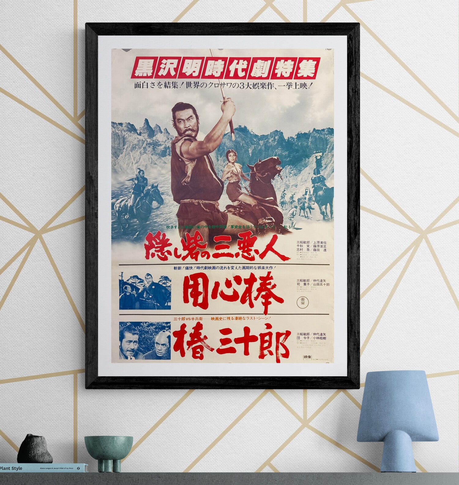 A superb, cinema-forward composition built like a triple-bill of impact: the top half explodes with dynamic action imagery and bold red festival-style typography, while the stacked title blocks below spotlight the film’s core characters and dramatic tension. Mifune is front and centre—fierce, commanding, and instantly recognisable—balanced by the striking presence of Misa Uehara, with smaller vignette stills anchoring the narrative beats. The overall effect is loud, graphic, and unmistakably late-Showa in tone: a reissue poster designed to sell the spectacle, not merely decorate.