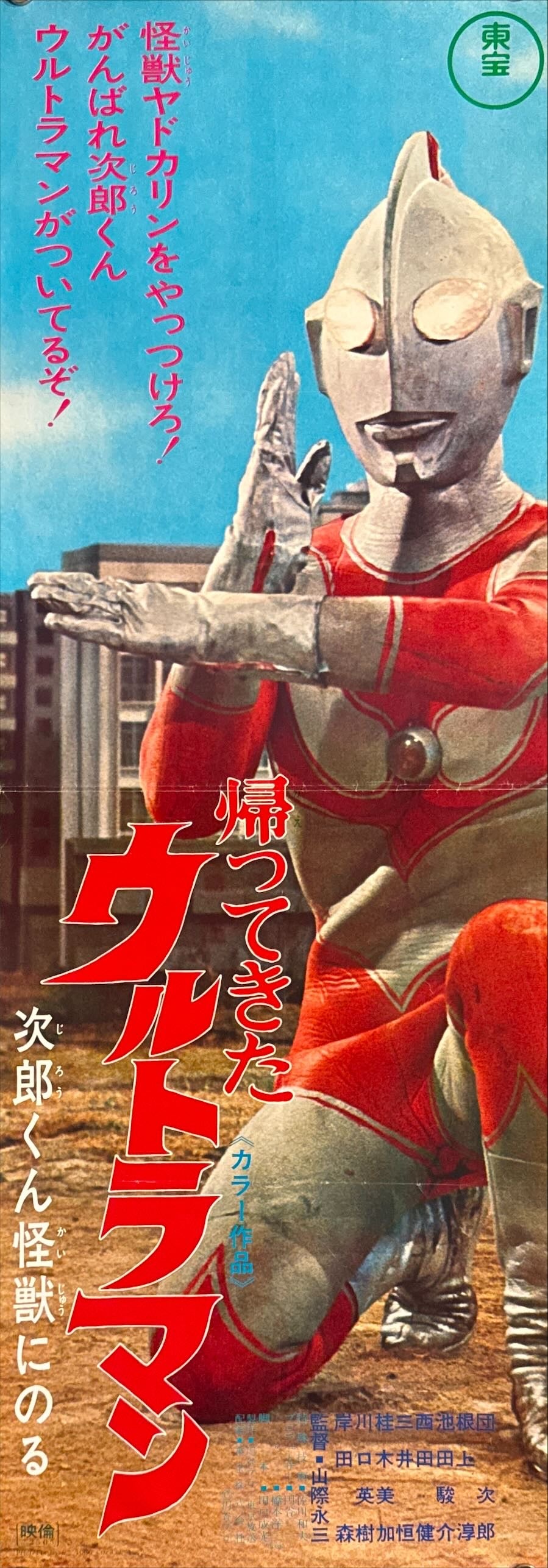 Speed posters were printed in a tall, narrow format for display in theatre lobbies, corridors, and ticket areas—far fewer were produced than the standard B2 size, and survival rates are low. Here, the design is brilliantly direct: a saturated sky-blue field frames Ultraman in a dramatic fighting pose, while the enormous vertical red title typography (“帰ってきたウルトラマン”) delivers maximum impact from a distance. The energetic vertical copy at upper left (“怪獣ヤドカリンをやっつけろ!…”) adds pure period charm, and the Toho branding and © TOHO CO., LTD. 1972 print line anchor it firmly as authentic early-’70s Japanese theatrical ephemera.