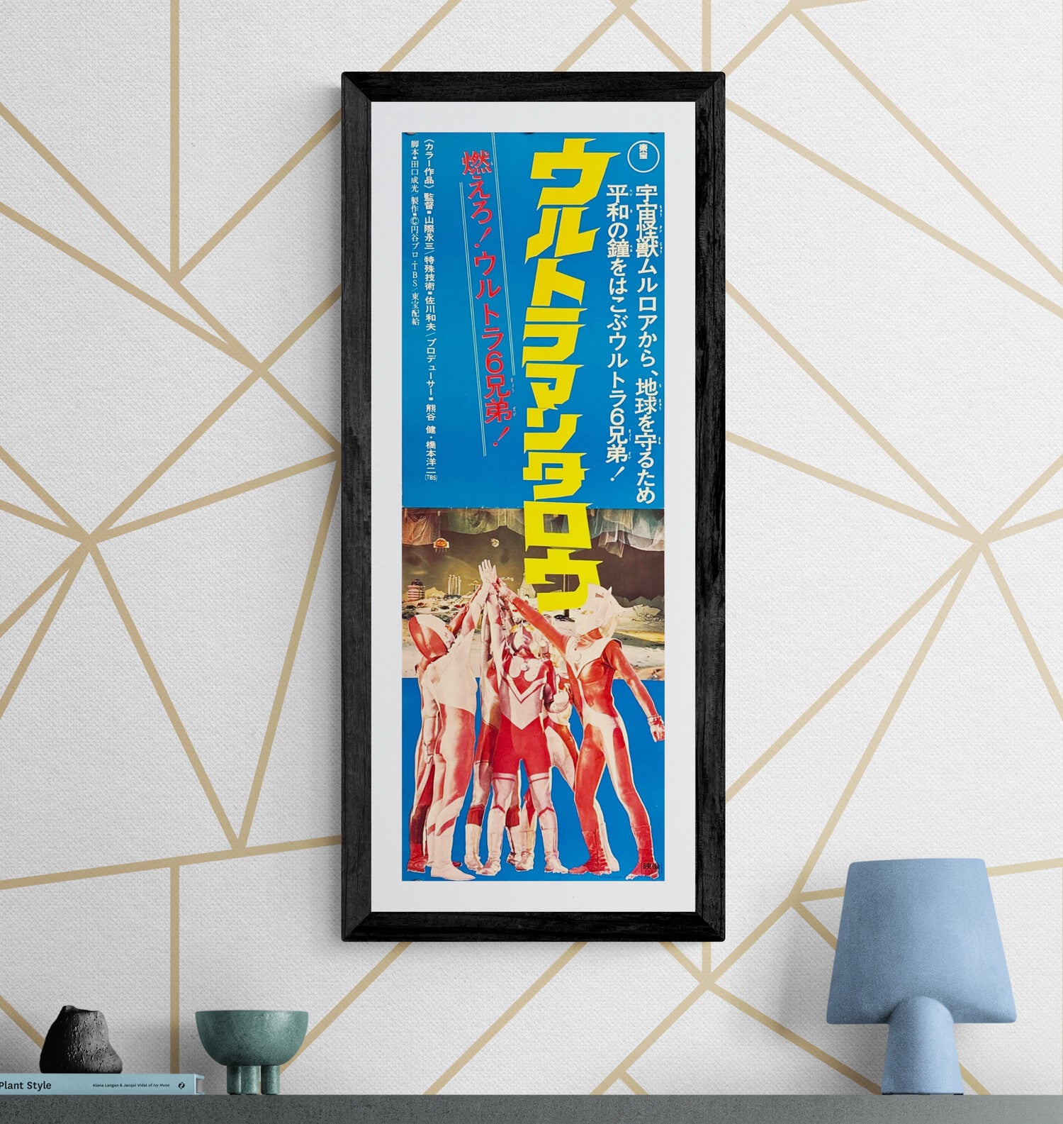Speed posters were printed in a tall, narrow format for display in theatre lobbies and ticket halls, and far fewer were produced than the standard B2 size. This design stacks bold lemon‑yellow title typography against a saturated blue field, with copy running vertically down the right. The lower section shows Taro joining the other Ultra Brothers in a dramatic team huddle on a lunar landscape, capturing the series’ mix of space‑age fantasy and heroic tokusatsu action. It’s a striking piece of 1970s Japanese graphic design and a perfect complement to any Ultraman or Showa‑era sci‑fi collection.