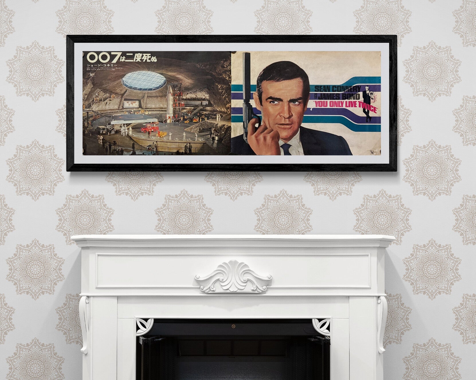 The right panel switches to bold illustration: a painted portrait of Sean Connery as Bond, Walther pistol raised, is set against rhythmic teal and purple stripes. English typography reads “SEAN CONNERY IS JAMES BOND ‘YOU ONLY LIVE TWICE’”, with a small silhouetted Bond holding a crash helmet at the far right. The combination of photographic spectacle and graphic portraiture neatly captures both the film’s futuristic excess and its cool 1960s spy iconography.
