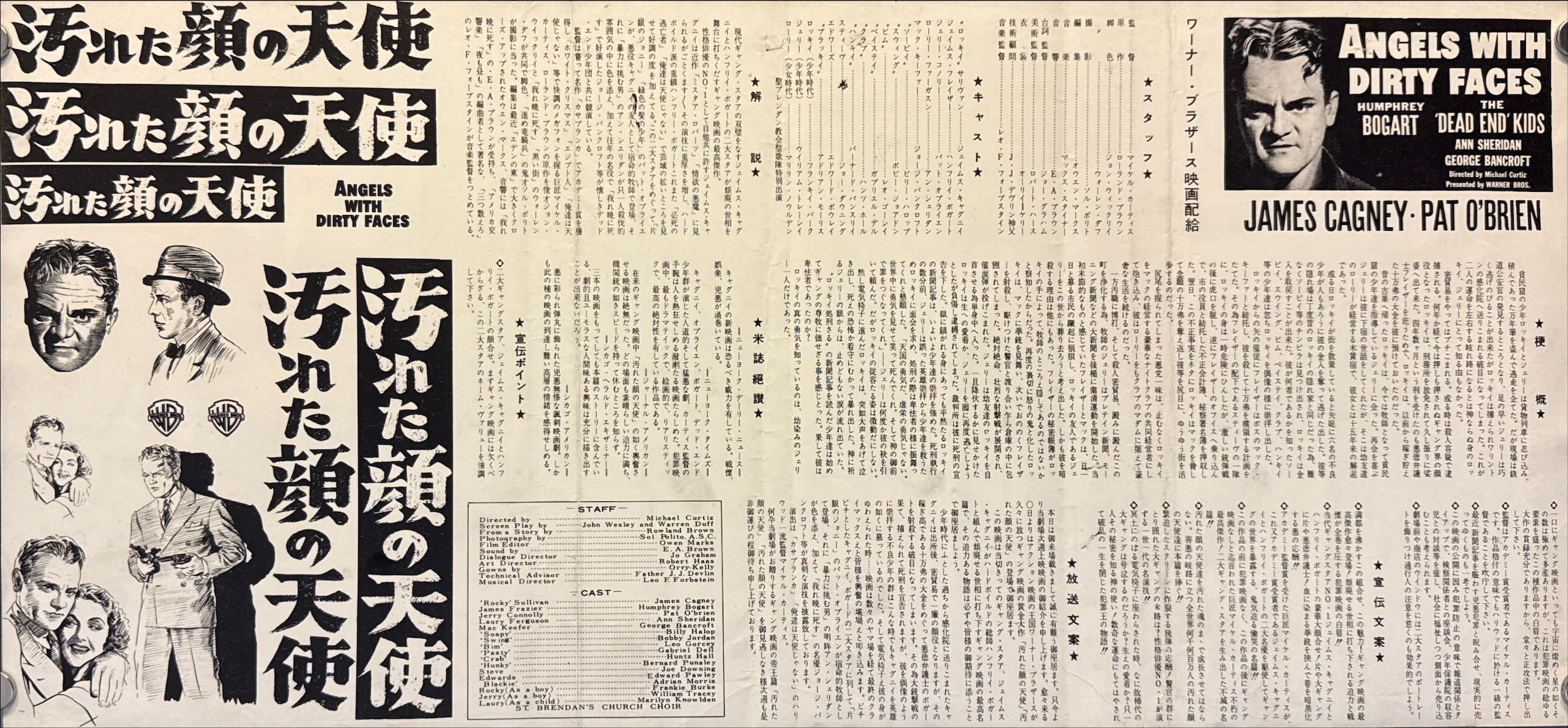 This is an original Japanese speed poster / press-sheet printed in 1949 for the first Japanese release of Angels with Dirty Faces (汚れた顔の天使), a United States crime drama directed by Michael Curtiz, starring James Cagney and Pat O’Brien, with Ann Sheridan and George Bancroft (featuring an early role by Humphrey Bogart).