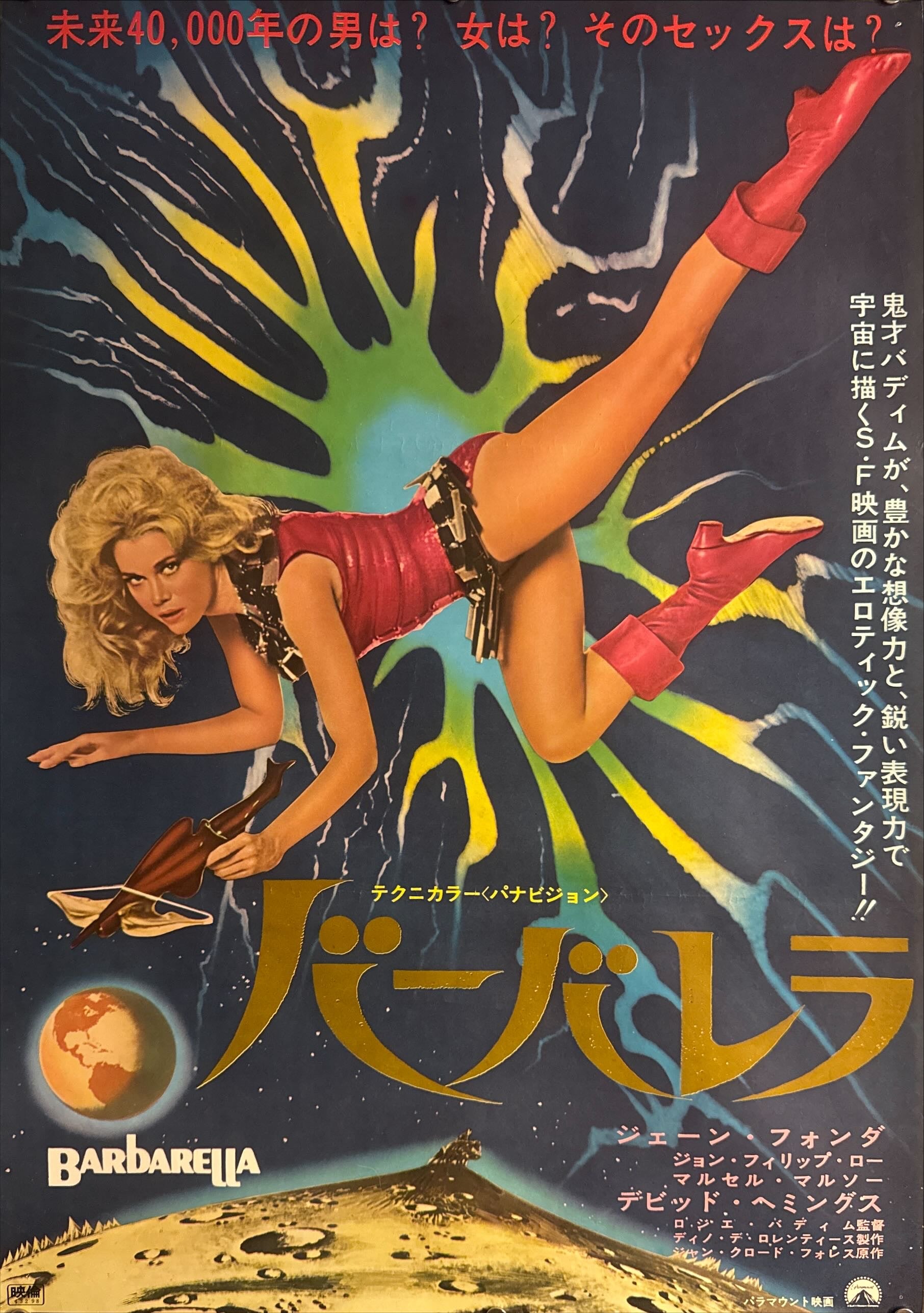 This first‑issue Japanese sheet is pure visual impact: Jane Fonda’s body becomes the composition’s diagonal engine, “floating” across a deep cosmic field while an electric blue‑green explosion radiates outward like a psychedelic flower or plasma burst. The huge metallic‑gold katakana title 「バーバレラ」 dominates the lower field like a luxury brand mark, with テクニカラー〈パナビジョン〉 printed just above—an irresistible period flex. At the top, the famous red headline reads 「未来40,000年の男は? 女は? そのセックスは?」—a sensational hook that translates roughly as “Men in the year 40,000? Women? And what of their sex?”—while the right‑side vertical copy leans into the film’s erotic‑SF fantasy pitch. The lower area completes the tableau with Earth, lunar terrain, and small campaign details (including the Paramount credit and Japanese release typography), creating a design that feels both cinematic and unmistakably Japanese in its bold typographic confidence.