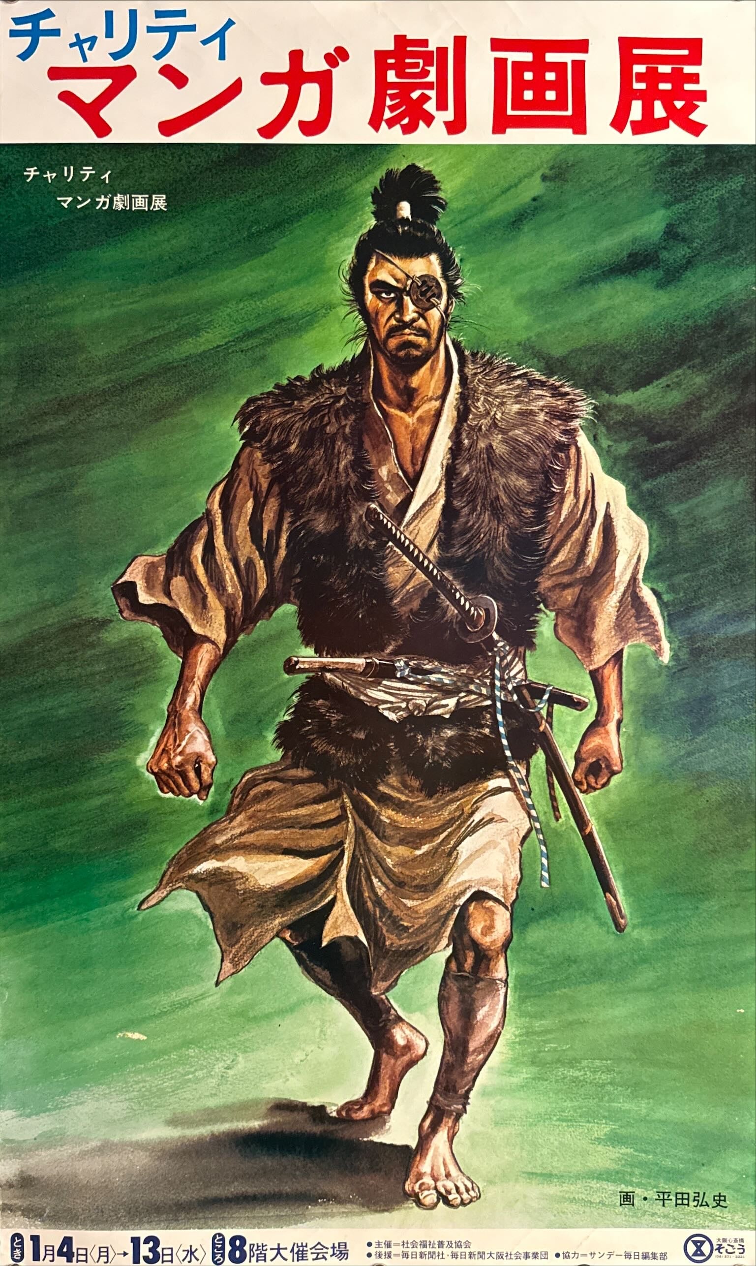 A superb, painterly composition centred on a powerful, forward-striding samurai figure rendered in rich, realistic colour against a dramatic green field—an image that perfectly reflects Hirata’s celebrated historical style. The bold headline typography in blue and red—チャリティ マンガ劇画展—anchors the design at the top, creating a striking balance between graphic modernism and classical period illustration. A highly displayable, collector-grade piece for fans of gekiga and Japanese historical manga art.