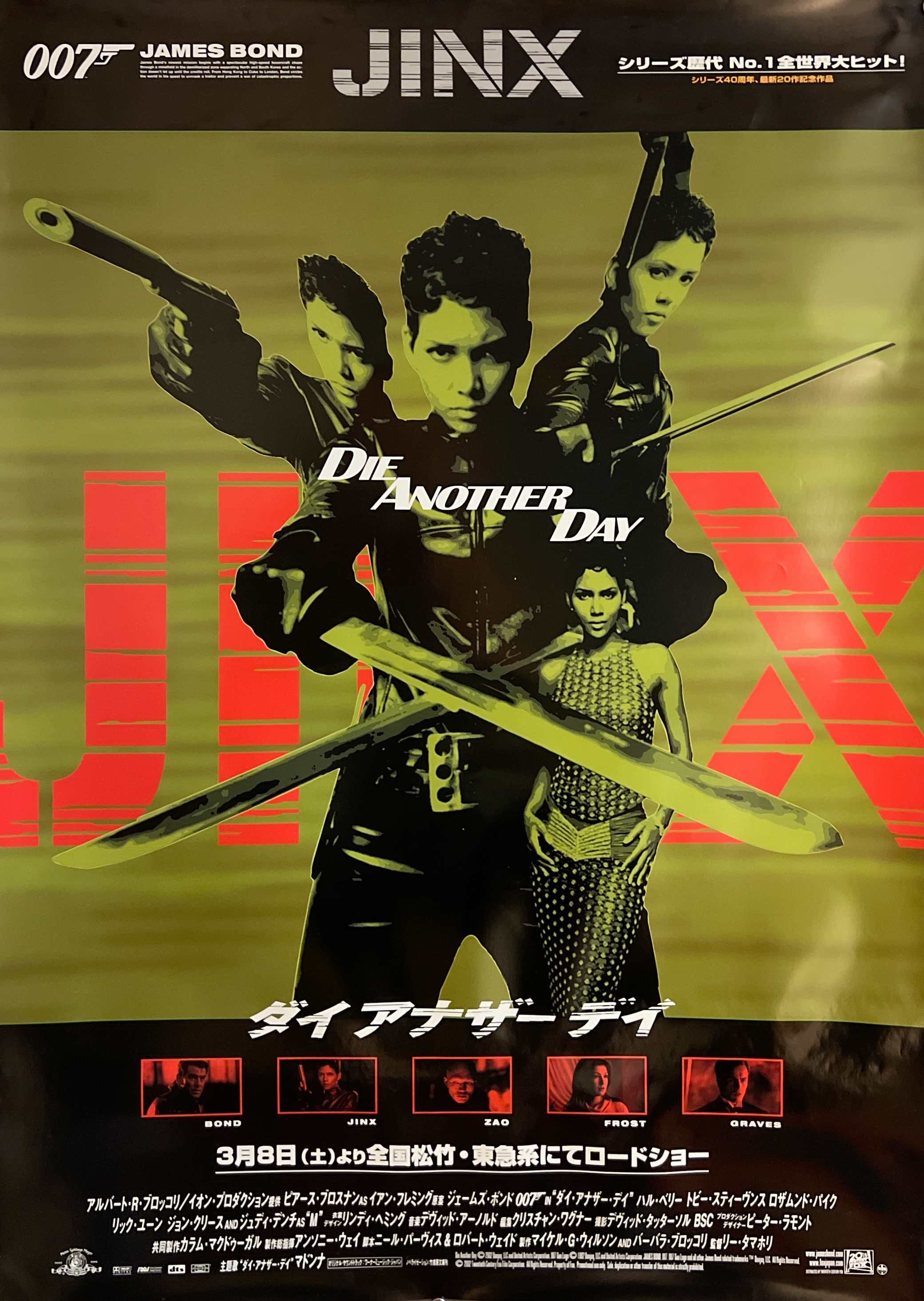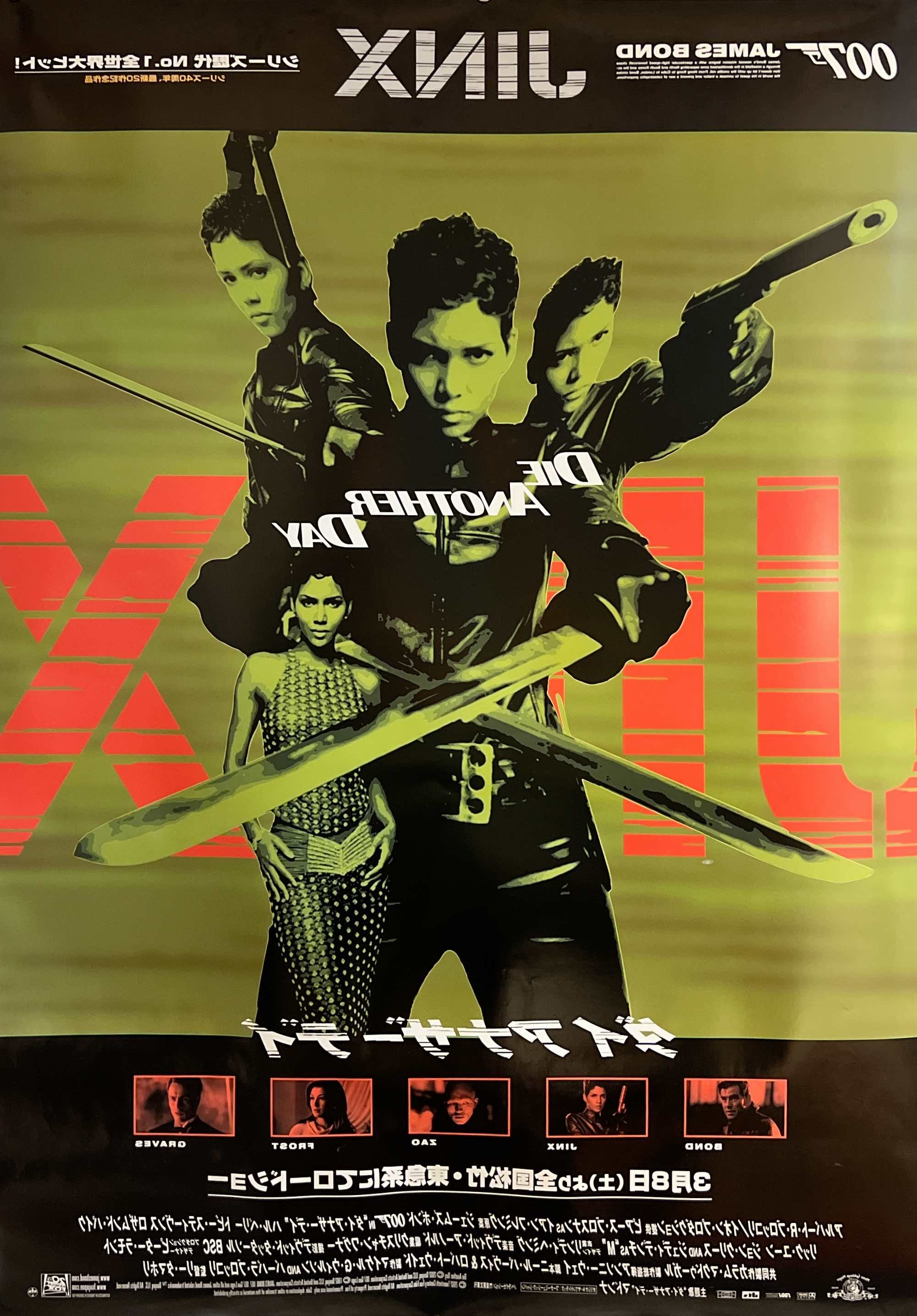 This is a superb and highly unusual Japanese character-focused design, dominated by Halle Berry as Jinx in a bold, graphic montage rendered in acid green, black, and red. The composition is far more stylised than the standard international one-sheet, with multiple Jinx poses arranged around the title and a small figure of Bond integrated into the lower character strip. The result is sharp, modern, and unmistakably early-2000s in tone, while still feeling distinctly Japanese in its layout and visual restraint.