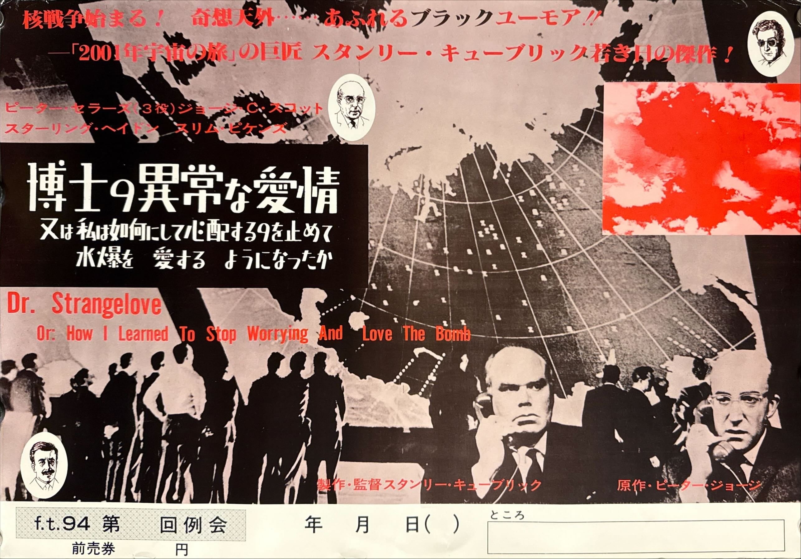 This is an original Japanese B3 promotional poster produced for a 1970 Japanese re-release screening of Stanley Kubrick’s Dr. Strangelove (1964). Unusually, it was made for the 94th regular meeting (第94回例会) of a film appreciation society known as f.t. (Film Theatre)—a wonderful surviving piece of community cinema culture, designed to be completed locally with screening details and used to publicise the event.