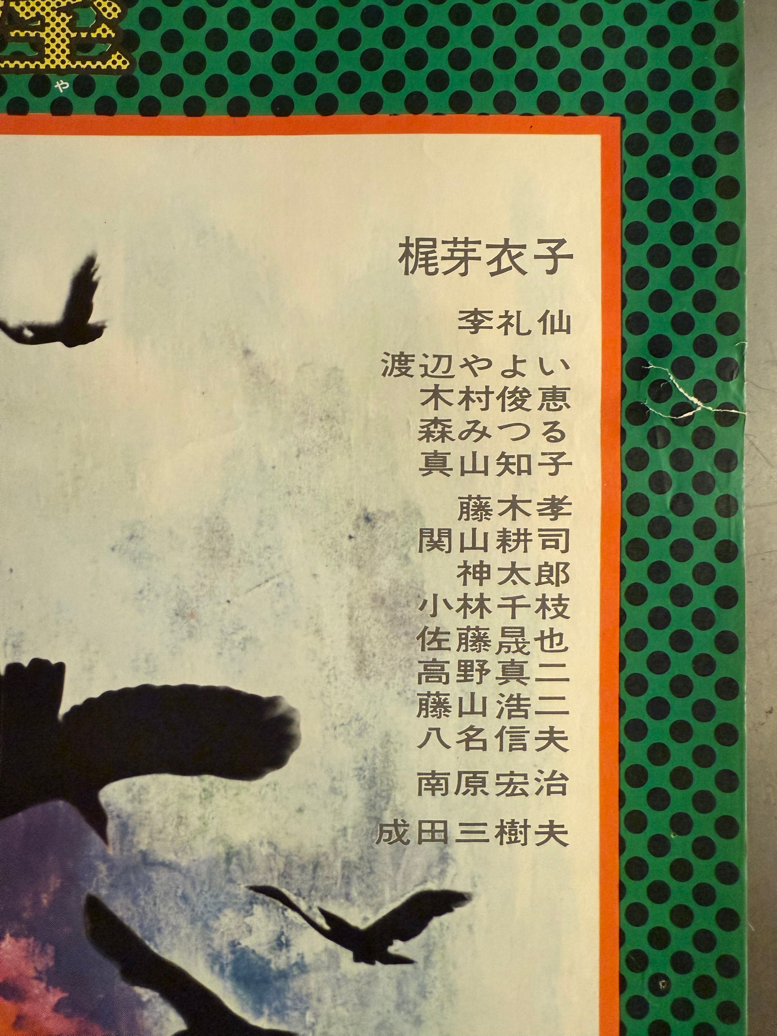 This Japanese B2 design is one of the great images of the series. Against a vivid green halftone background, Meiko Kaji appears as a towering black-clad figure in hat and cloak, knife in hand, transformed into an almost mythic avenger. A huge crow dominates the lower foreground, while smaller birds wheel through the composition, reinforcing the film’s atmosphere of menace, isolation, and dark symbolism. The oversized pink title 女囚さそり at the top and the gold けもの部屋 subtitle beneath give the poster tremendous graphic force. It is bold, instantly recognisable, and exceptionally displayable — exactly the kind of striking Japanese exploitation artwork collectors hope to find.