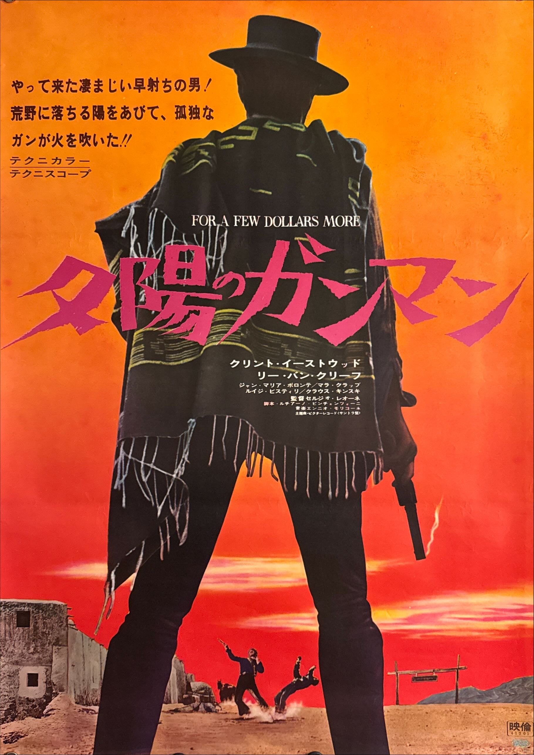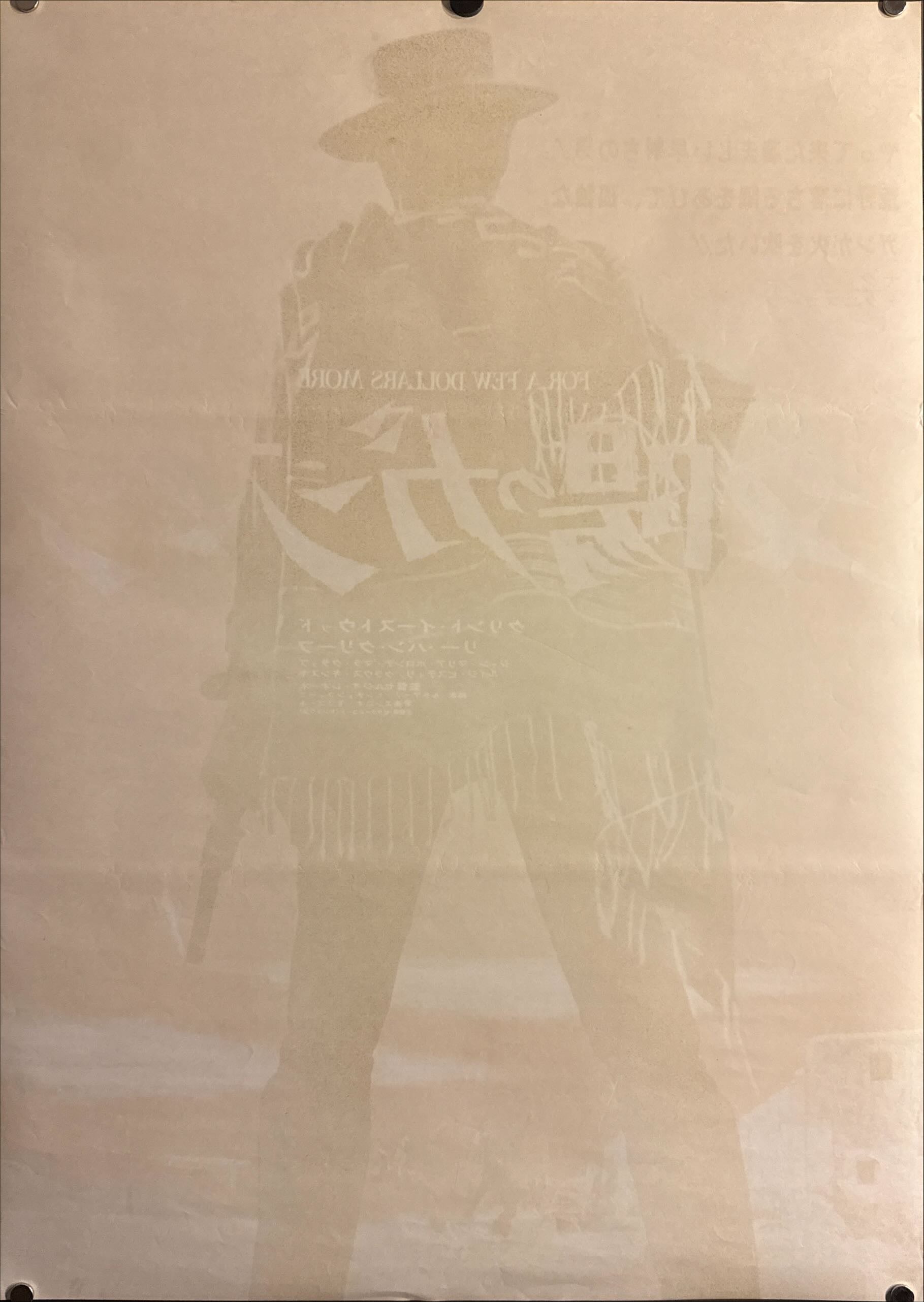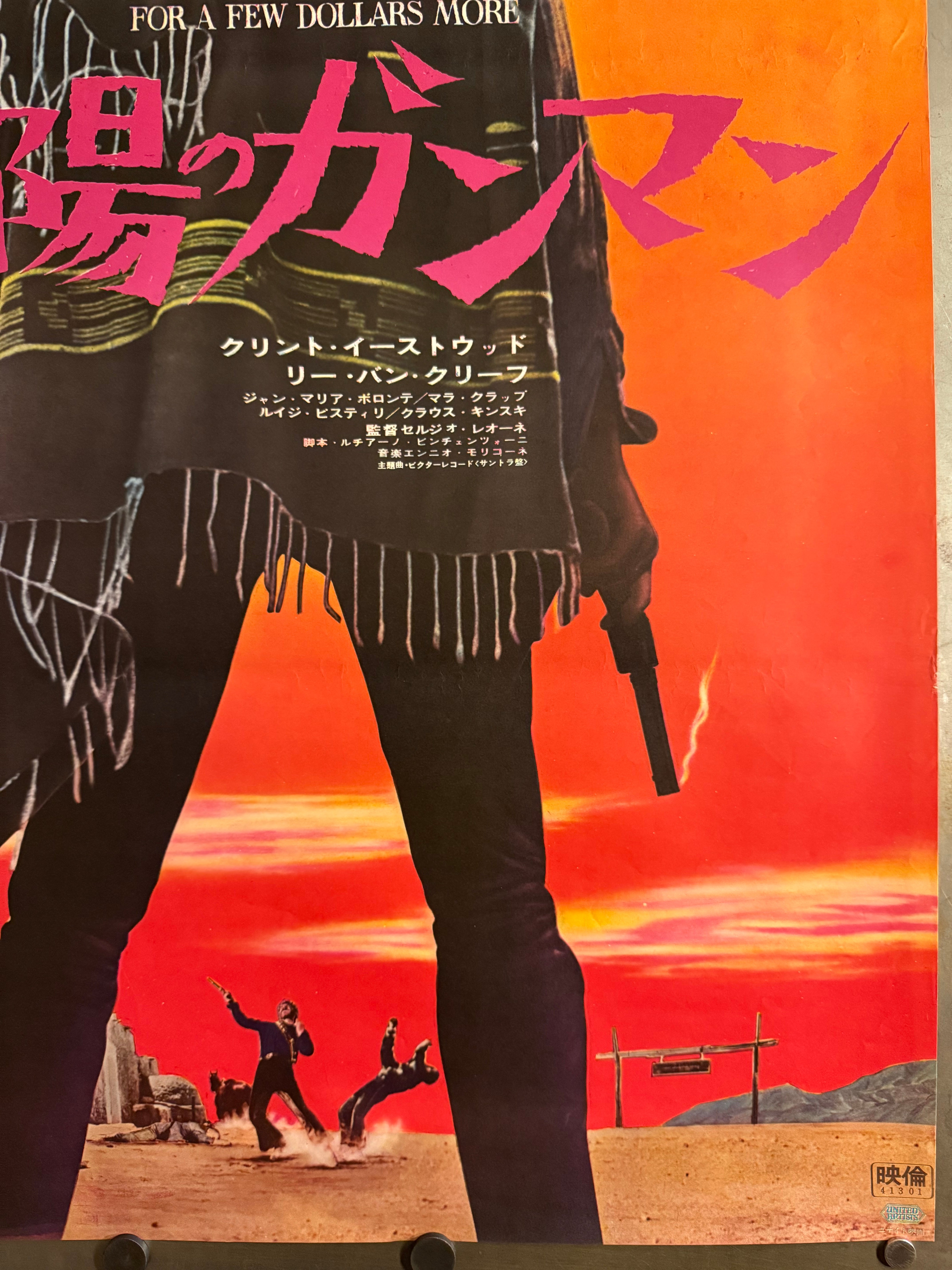 This is an original Japanese poster, printed in 1966 (Shōwa 41) for the first Japanese theatrical release of Sergio Leone’s For A Few Dollars More (Japanese title: 夕陽のガンマン). First-release B2s were printed in far fewer numbers than the 1972 re‑issue; they surface only rarely—even in Japan. This is only the third copy we have handled. For perspective, over the past five years we have seen 30+ examples of the 1972 re‑release for sale, but less than 5 of the original 1966 first issue in more than seven years. The bottom‑right credit block confirms the year (Shōwa 41) and the United Artists logo on this poster differs from the later re‑release, making identification straightforward for collectors.