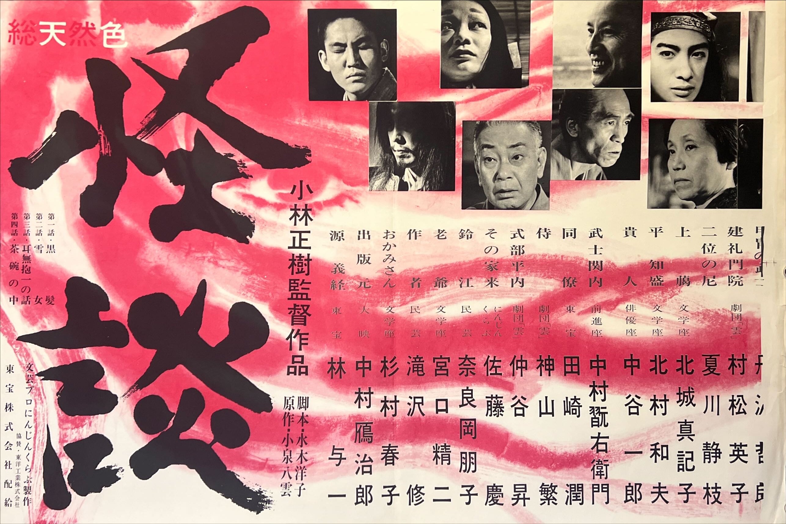 Dramatic brush-stroke design – The title 怪談 (“Ghost Stories”) explodes across a blood-red sumi-ink wash, flanked by monochrome portrait vignettes of the film’s large ensemble cast.