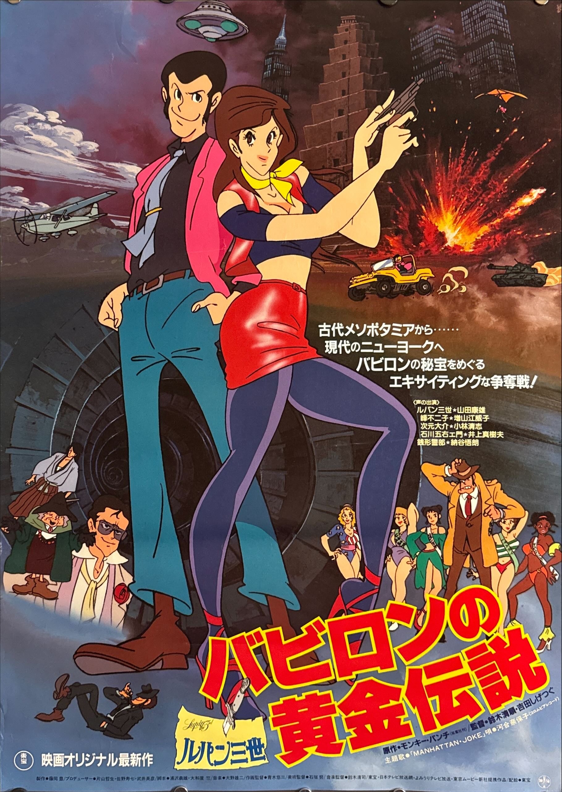 This is an original Japanese B2 poster printed in 1985 for the cinematic feature Lupin III: The Legend of the Gold of Babylon from Tokyo Movie Shinsha (TMS). Set largely in New York, the caper hurls Lupin, Jigen, Goemon, Fujiko, and ever-pursuing Inspector Zenigata into a scramble for the fabled treasure of ancient Babylon—blending series hallmark slapstick with occult mystery and mafia intrigue. Scored by Yūji Ōno, the film sits at the wild, pop-art edge of the franchise’s 1980s output and remains a cult favorite with Lupin collectors.