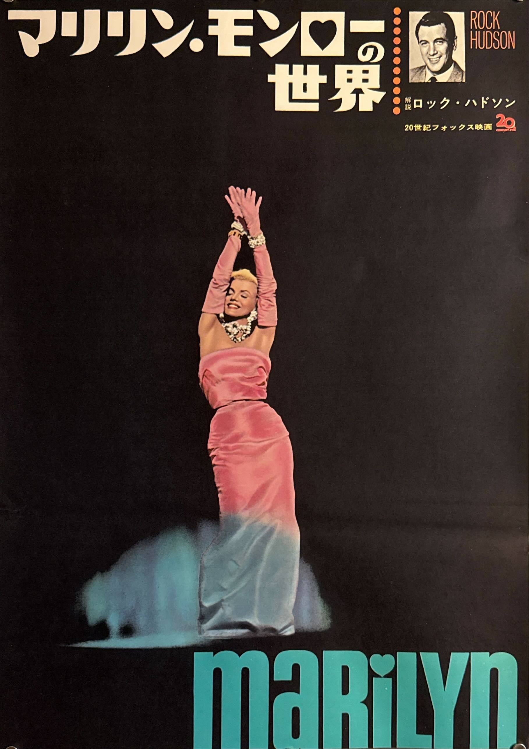 A superb piece of early-1960s Japanese graphic restraint: Monroe appears alone on a deep black field, posed like a stage performer in a long pink gown and gloves, spotlighted with a soft, mist-like blue at her feet. The typography is equally confident—large, blocky katakana title 「マリリン・モンローの世界」 across the top, a small Rock Hudson credit portrait at upper right, and the striking turquoise marilyn logotype anchoring the bottom edge. Minimal imagery, maximum presence—an elegant, gallery-like poster that feels closer to modern design than conventional film advertising of the period.