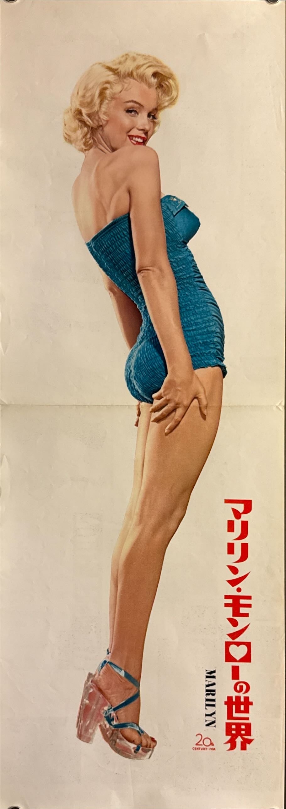 A wonderful two-sided piece that reads like a mini-exhibition of Monroe imagery. The front is pure, high-impact glamour: a full-length Monroe pin-up style pose in a vivid turquoise swimsuit, set against an expansive white field with the vertical red title 「マリリン・モンローの世界」 and 20th Century Fox mark—clean, modern, and immediately eye-catching at distance. The verso functions as an information-and-image panel: dense Japanese text copy for exhibitors, a lineup of Monroe poses (each captioned), and a grid of black-and-white stills that underline the documentary/retrospective positioning. As an object, it’s a perfect example of how Japanese cinemas sold Hollywood stardom in the early 1960s—bold on the front, editorial on the back.