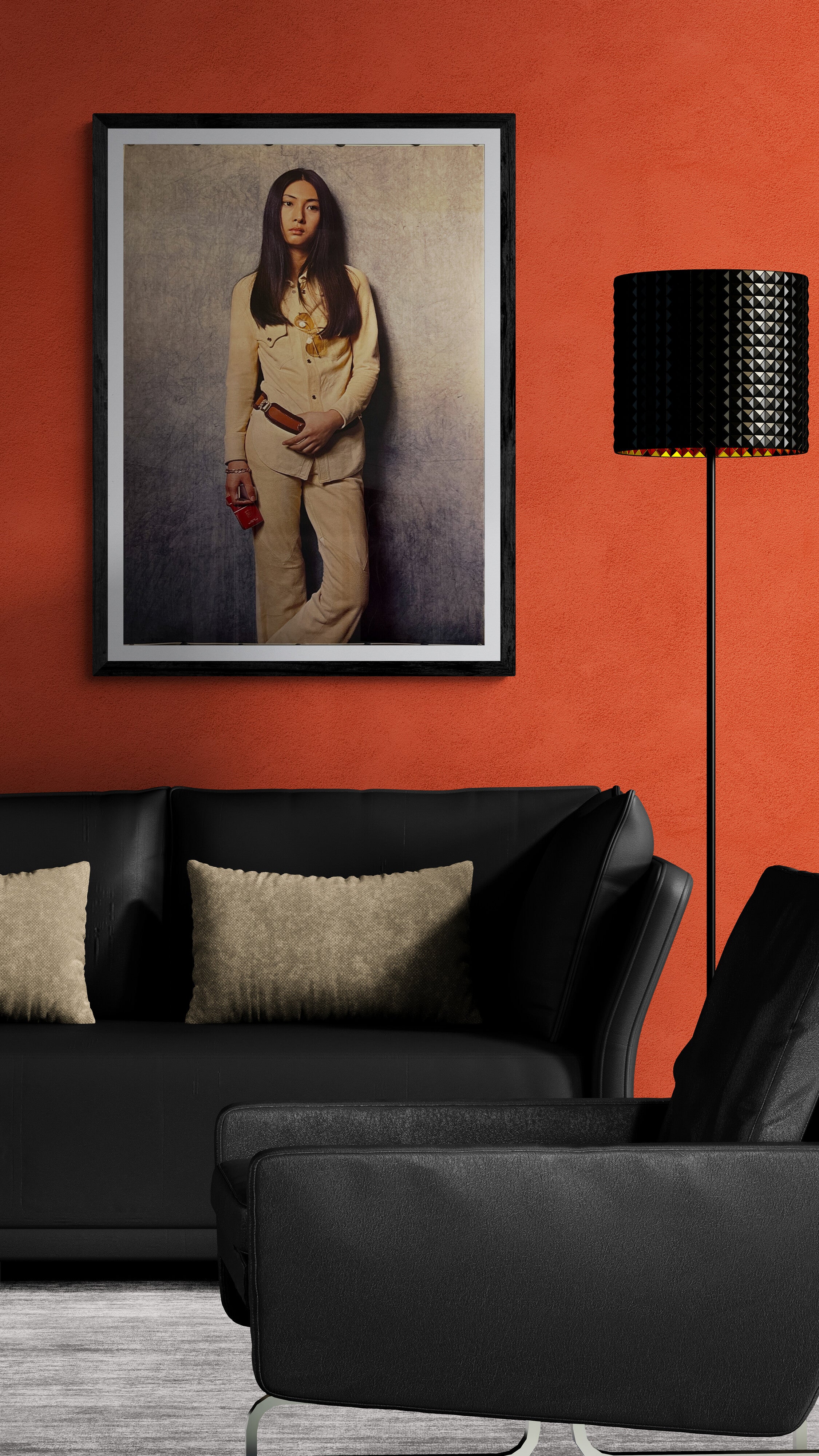 Minimalist, textured backdrop that makes the figure “float” (pure 1970s editorial energy)