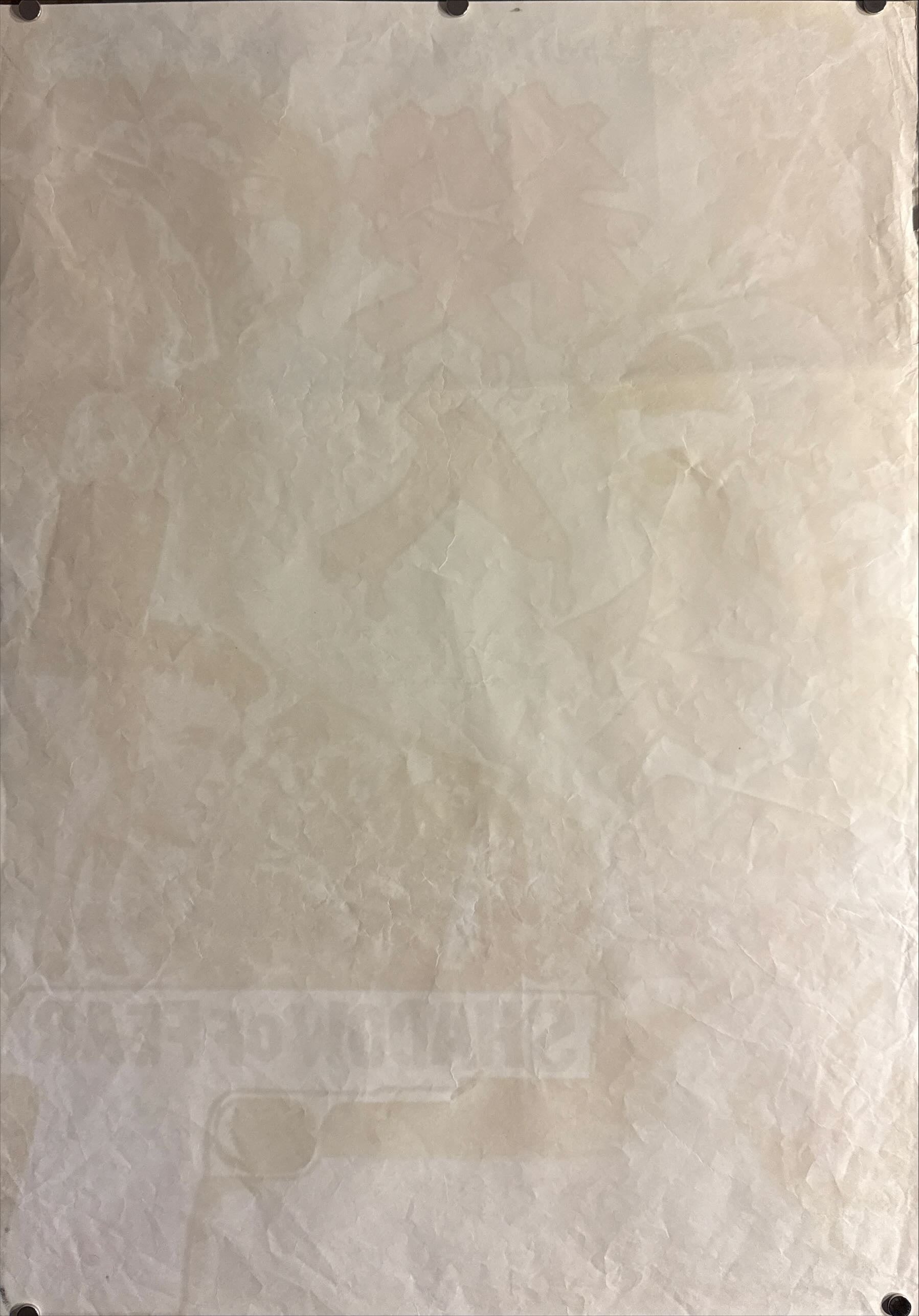 Gritty exploitation style with comic-noir flair: a giant blood-red title 殺人会社 drips down a rough-textured white field, encircled by vignettes of beatings, police dragnets, and tenement chases. At lower right, a bold pistol silhouette houses the English line SHADOW OF FEAR, while the Fox logo and Cinemascope tag complete the late-’50s/early-’60s crime aesthetic—raw, eye-grabbing, and very displayable.