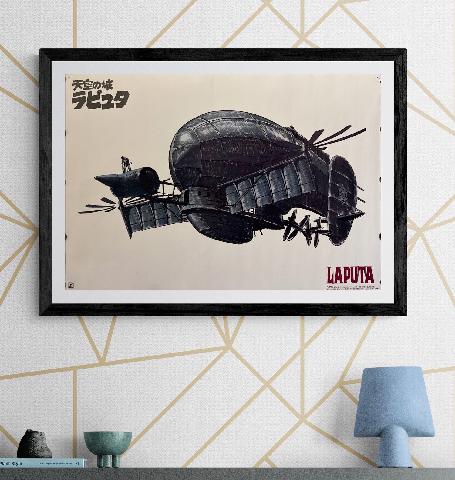 This is an original Japanese B2 poster printed in 1986 to promote Castle in the Sky (Laputa) in association with Animage / Tokuma (Animage mark present in the margin; small release text alongside the large “LAPUTA” logotype refers to the soundtrack issue). Early Studio Ghibli / Animage promotional sheets from the film’s launch year are highly collectible.