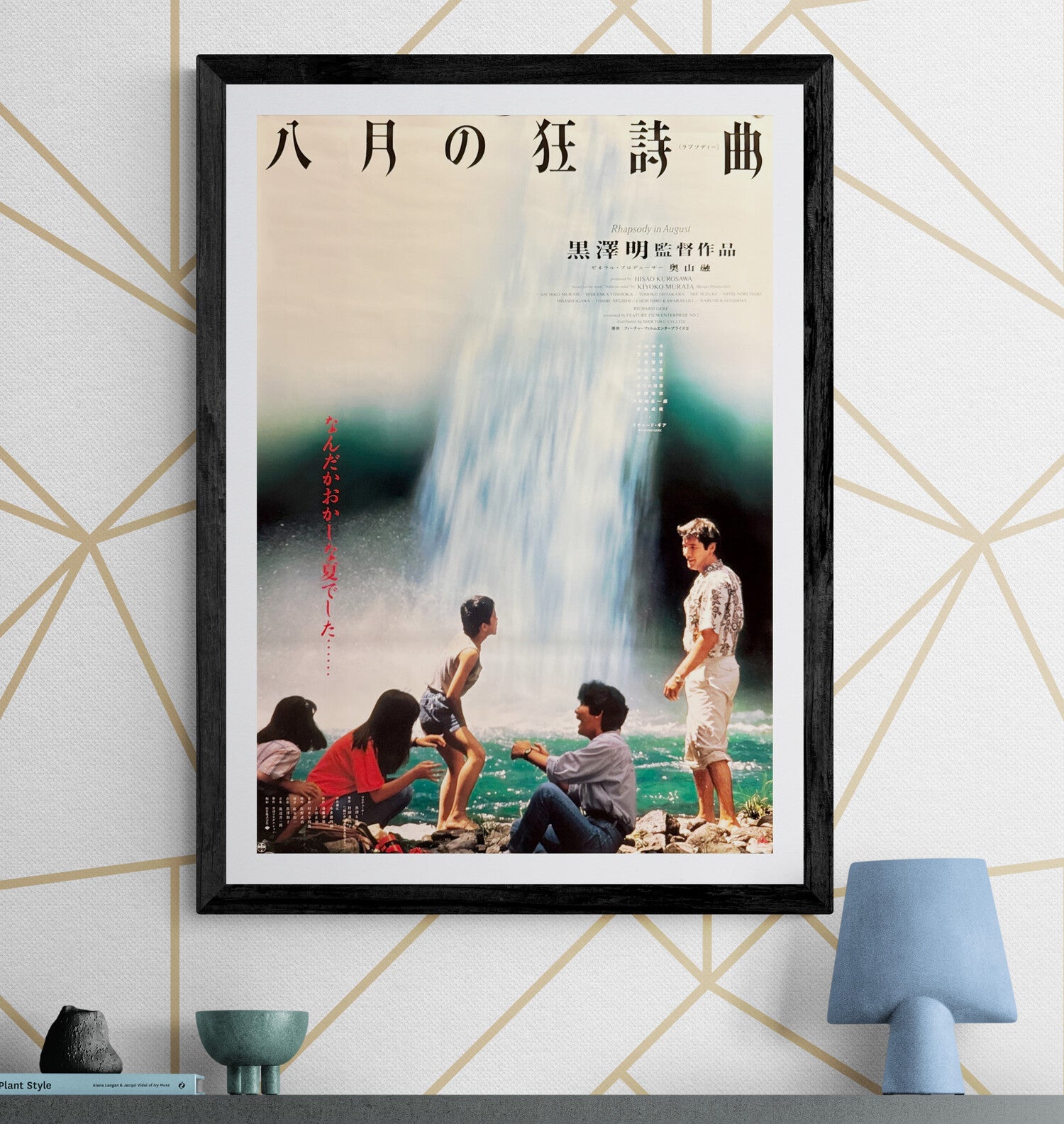 A beautiful, minimalist Japanese campaign design dominated by a towering waterfall—a poetic symbol of time, grief, and remembrance. The family scene at the water’s edge anchors the bottom in warm realism, while the upper field remains open and airy, allowing the typography to breathe: the Japanese title 「八月の狂詩曲」 across the top, and the refined credit block including 「黒澤明監督作品」 with the roman title Rhapsody in August. The vertical red copy at left reads like a whispered emotional refrain, adding a subtle sense of melancholy. Exceptionally frame-friendly and one of the most elegant Kurosawa poster designs of the 1990s.