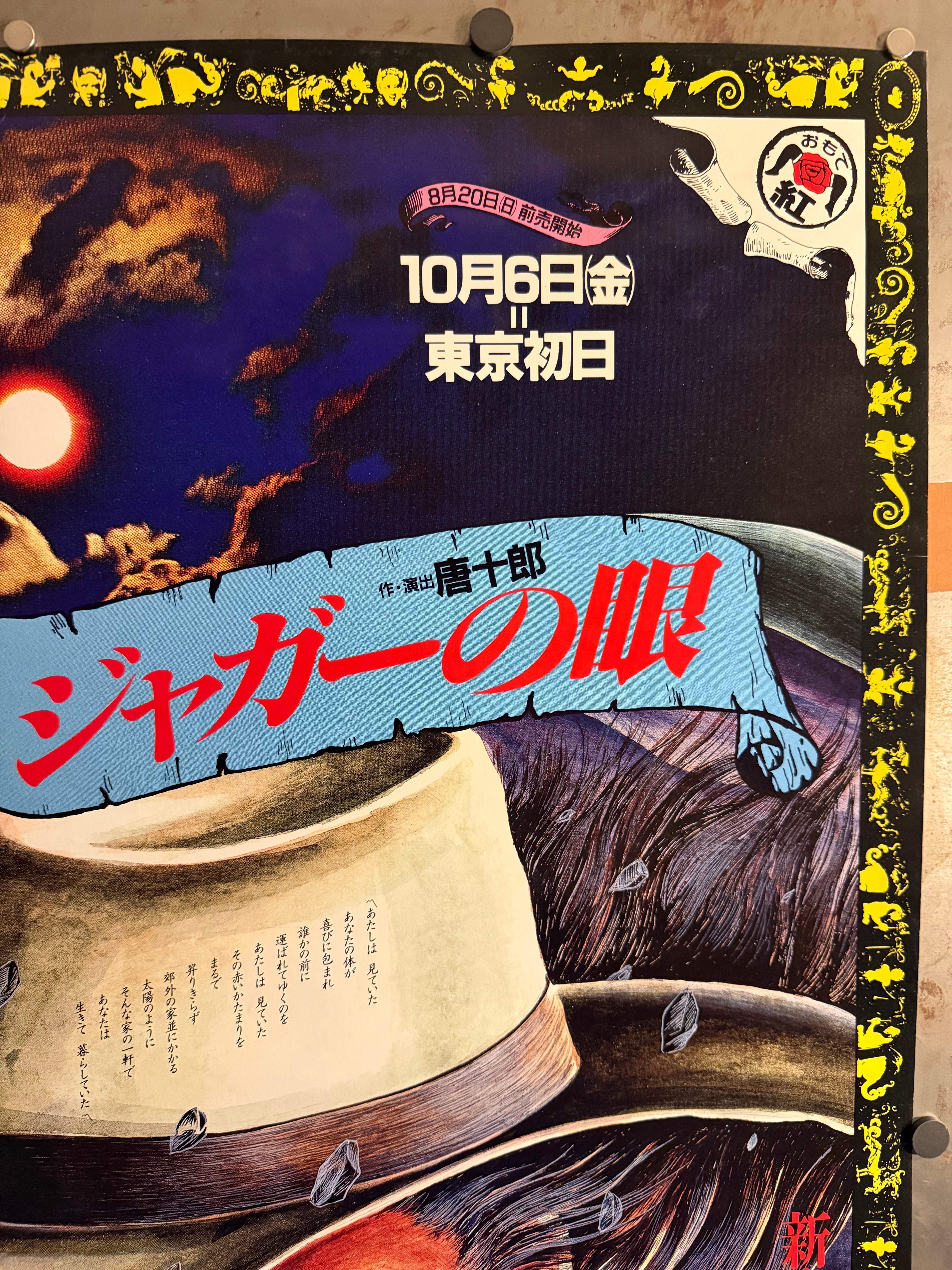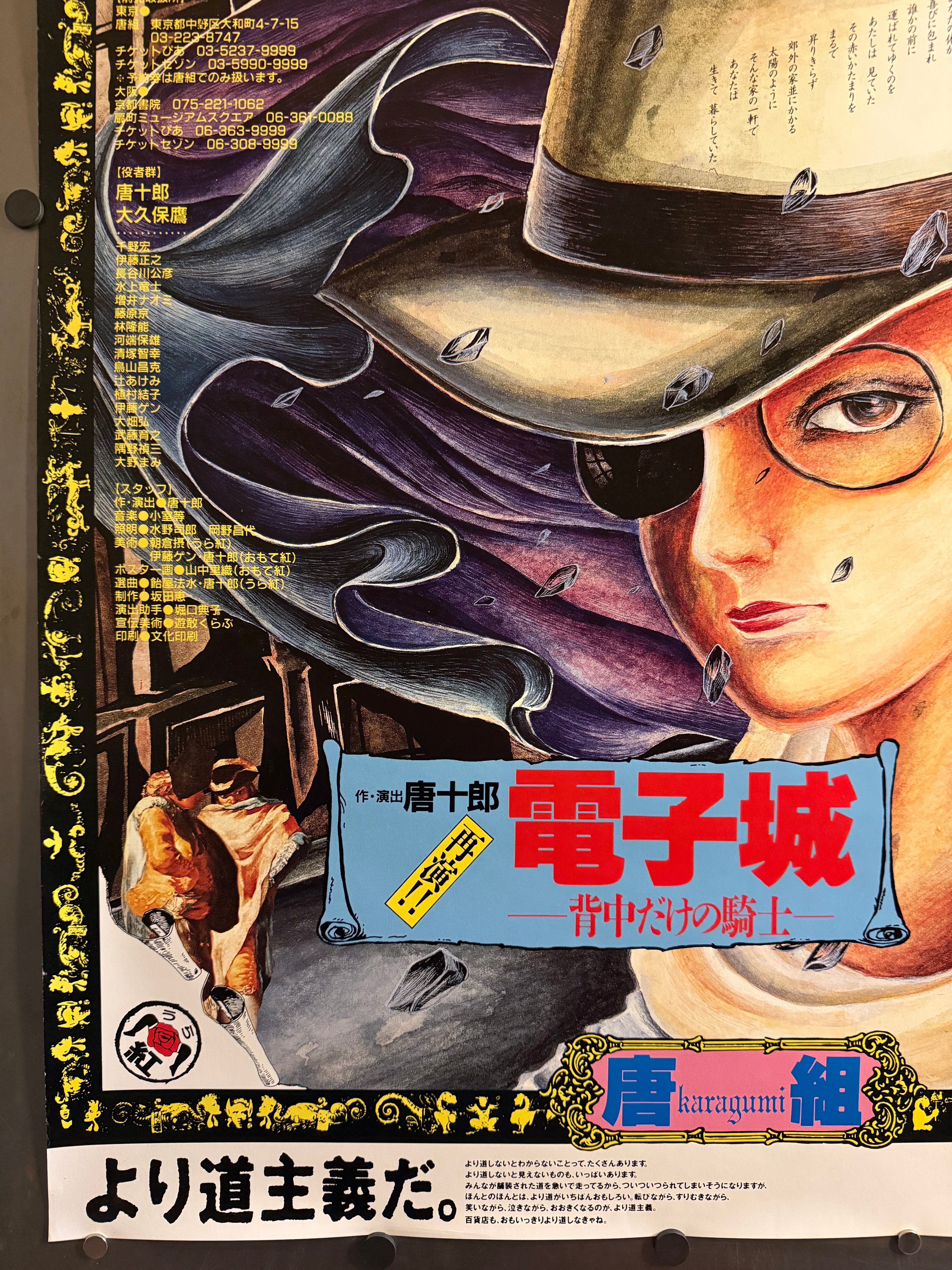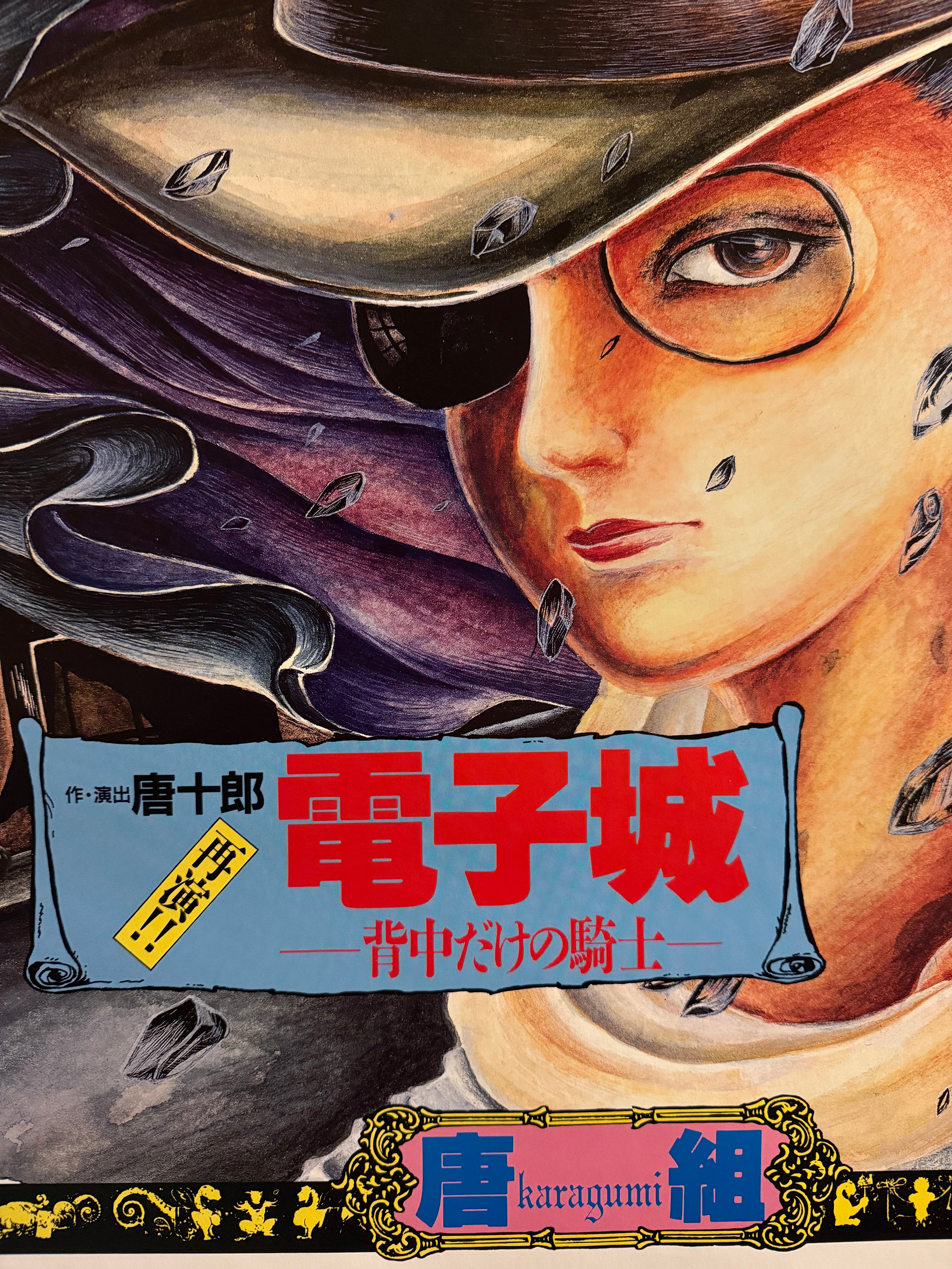 After closing Jōkyō Gekijō, Kara relaunched his itinerant Red Tent as Karagumi (唐組), continuing the spirit of Japan’s angura (underground) theatre. As with his earlier troupe, Kara paired radical performance with daring graphics by contemporary illustrators and designers. This large‑format sheet—drawn by Saori Yamanaka (山中里織)—announces a double bill (Jaguar’s Eye and Electronic Castle — The Knight with Only a Back). Surviving B1 examples from Karagumi’s Tokyo runs are scarce and highly collectible.