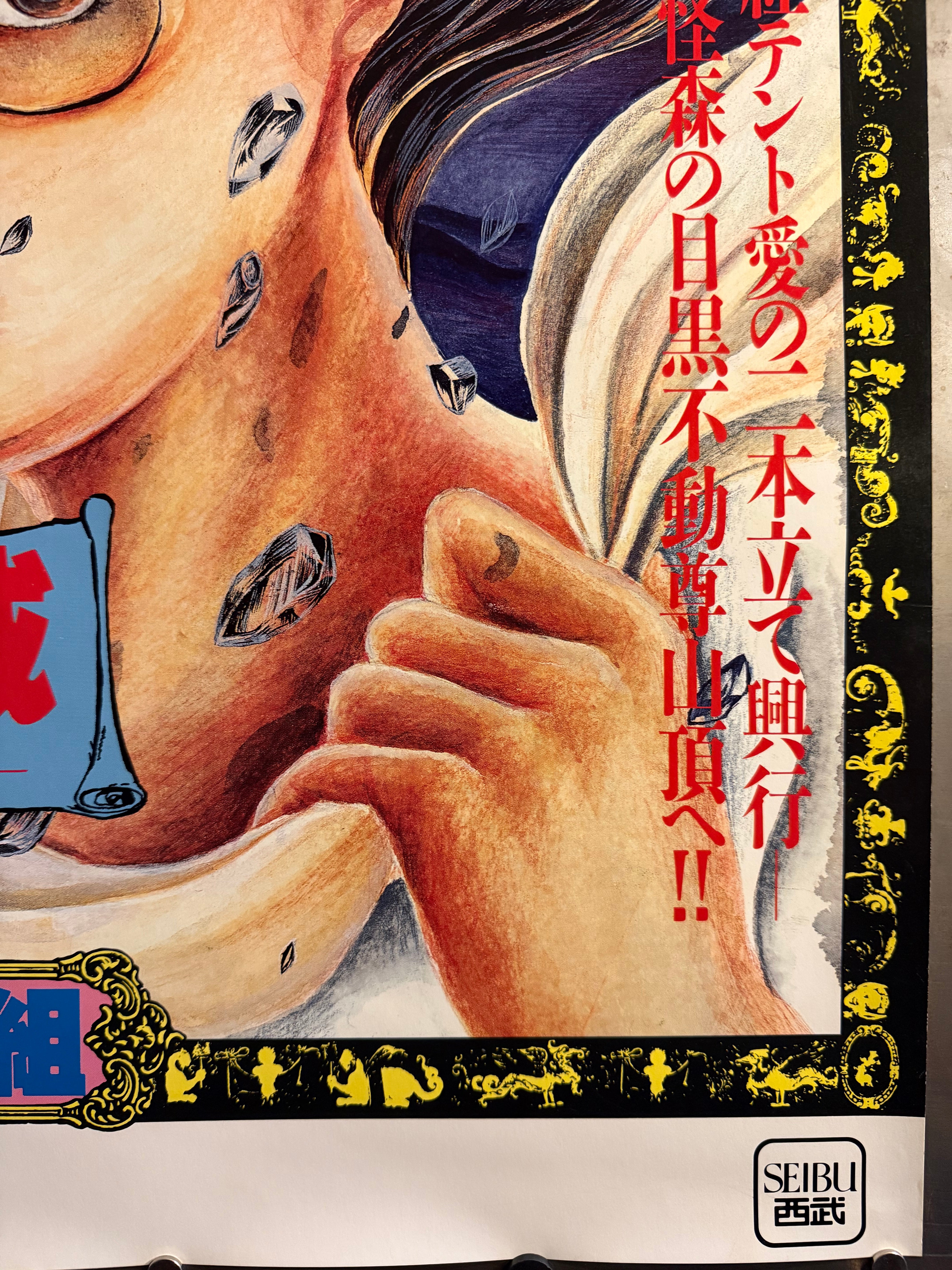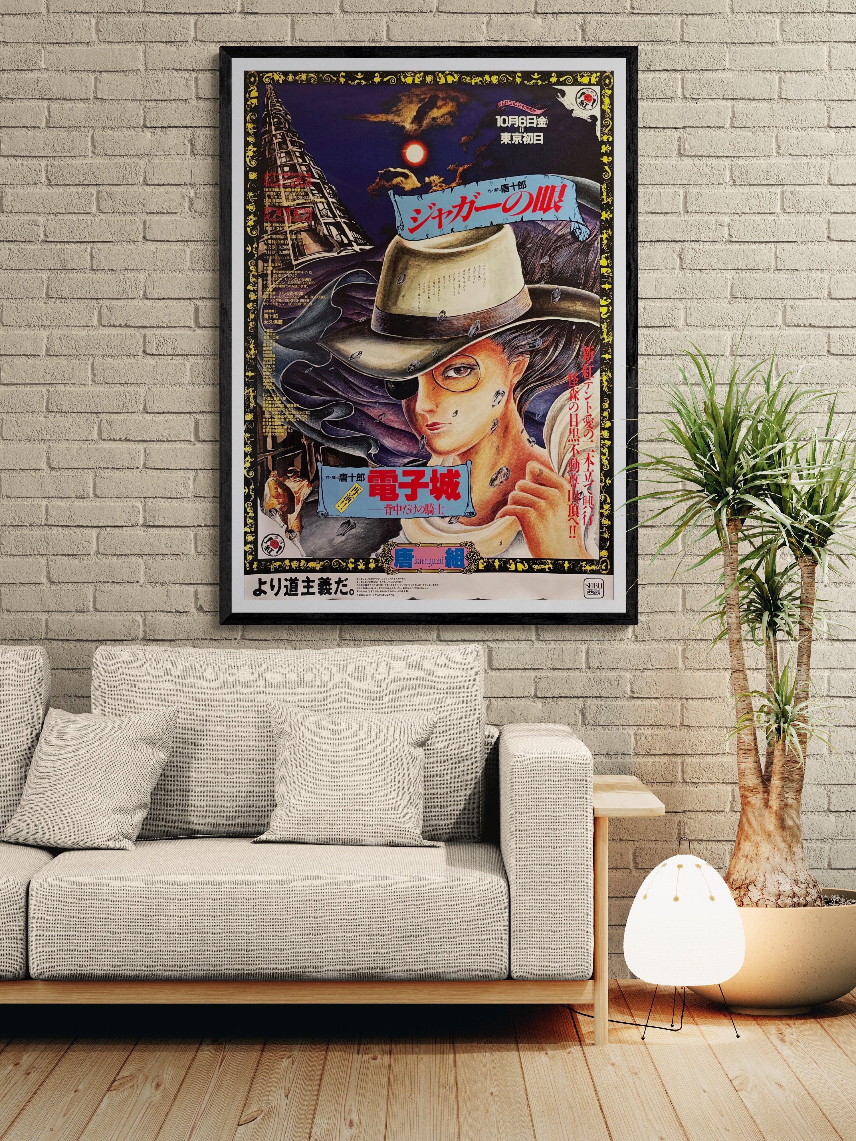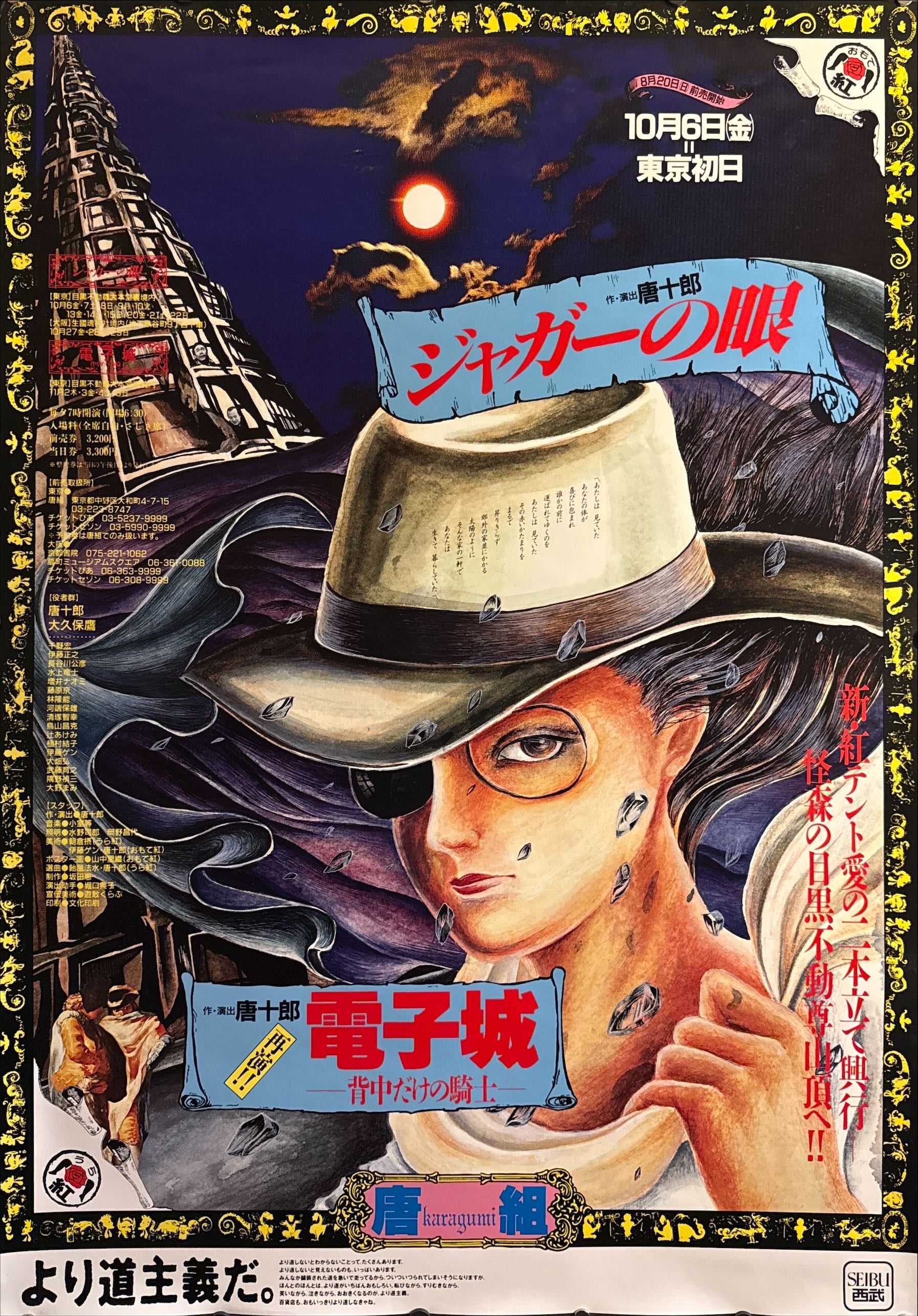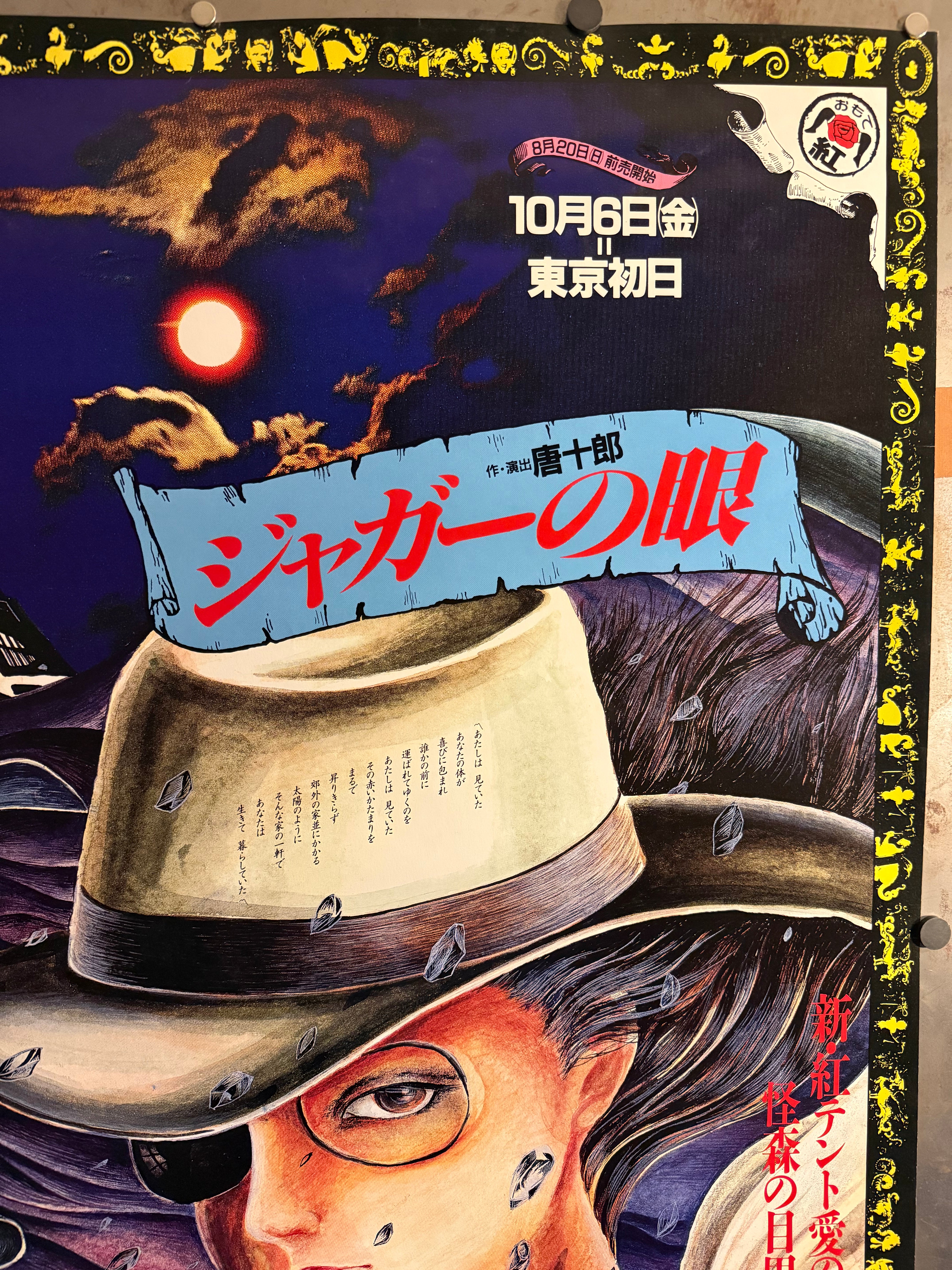 After closing Jōkyō Gekijō, Kara relaunched his itinerant Red Tent as Karagumi (唐組), continuing the spirit of Japan’s angura (underground) theatre. As with his earlier troupe, Kara paired radical performance with daring graphics by contemporary illustrators and designers. This large‑format sheet—drawn by Saori Yamanaka (山中里織)—announces a double bill (Jaguar’s Eye and Electronic Castle — The Knight with Only a Back). Surviving B1 examples from Karagumi’s Tokyo runs are scarce and highly collectible.