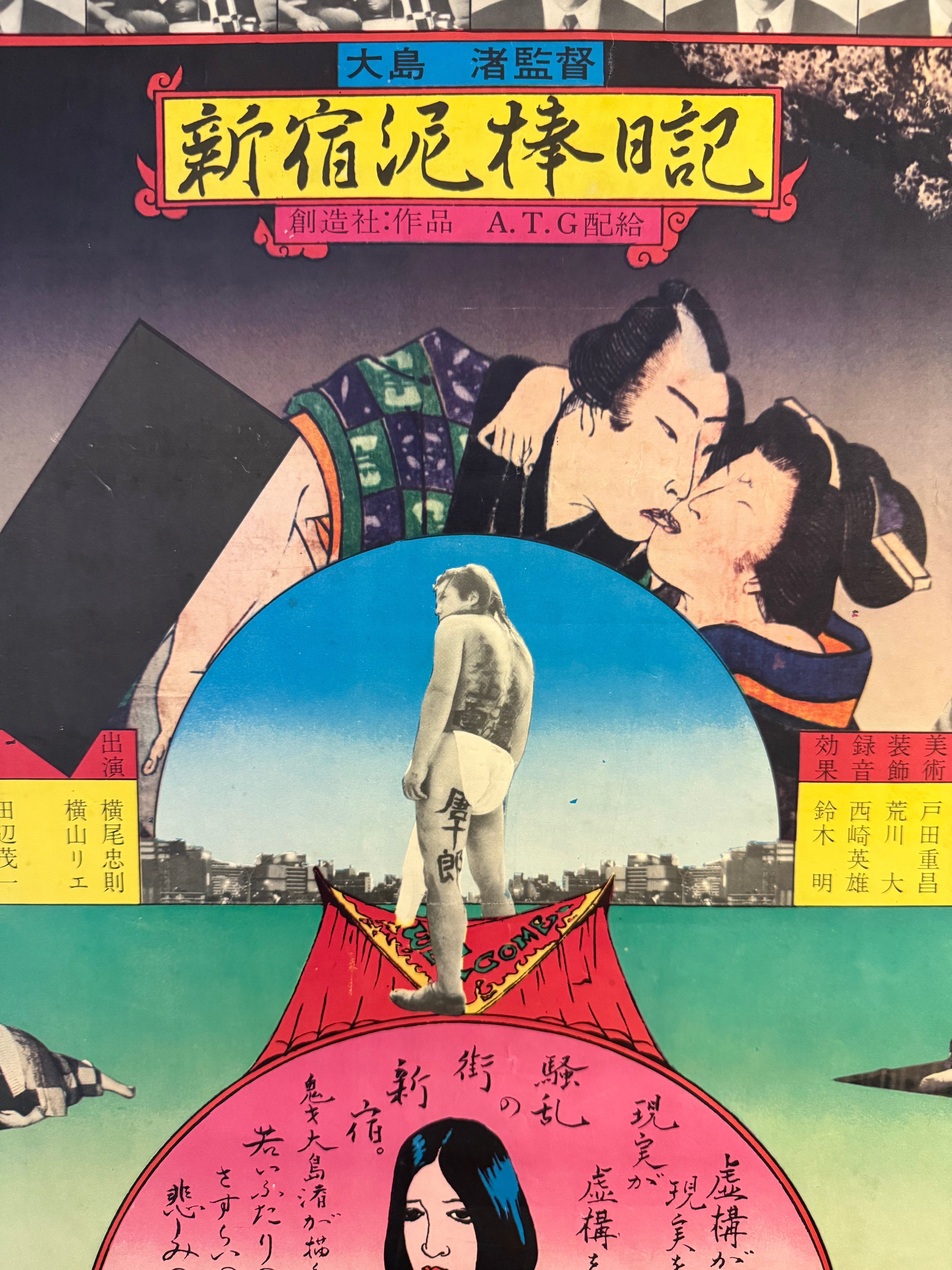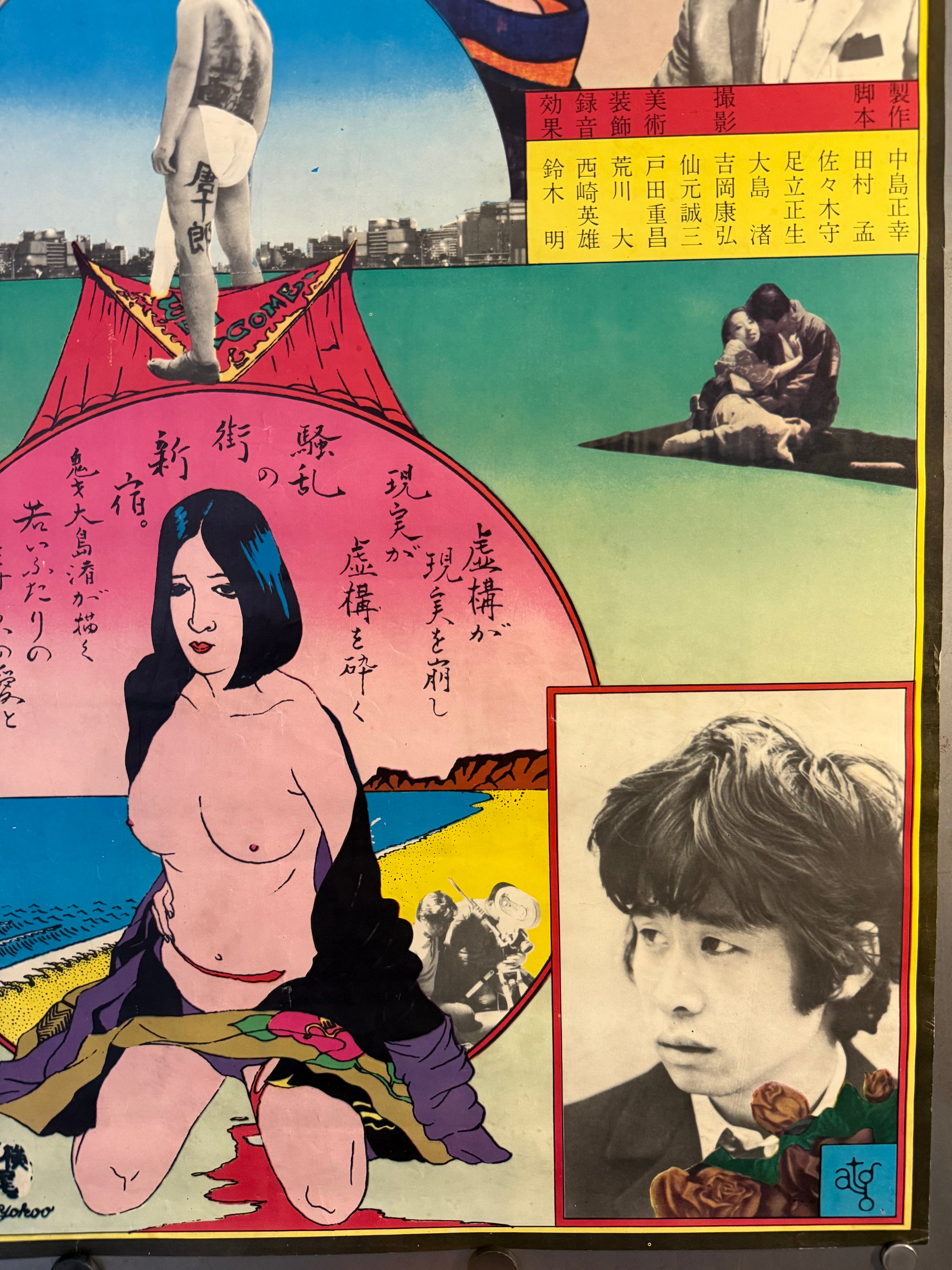 A scarce, first‑release Japanese poster for Ōshima’s New Wave landmark Diary of a Shinjuku Thief, starring Tadanori Yokoo—who also designed the film’s advertising artwork. (Yokoo plays the lead “Birdie Hilltop,” opposite Rie Yokoyama; the film was produced by Sōzōsha and released by ATG.)