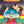 • At centre, a tattooed fundoshi‑clad figure stands on a red pennant against a cyan sky; above, ukiyo‑e lovers kiss—Yokoo’s playful collision of Edo iconography and contemporary Shinjuku.