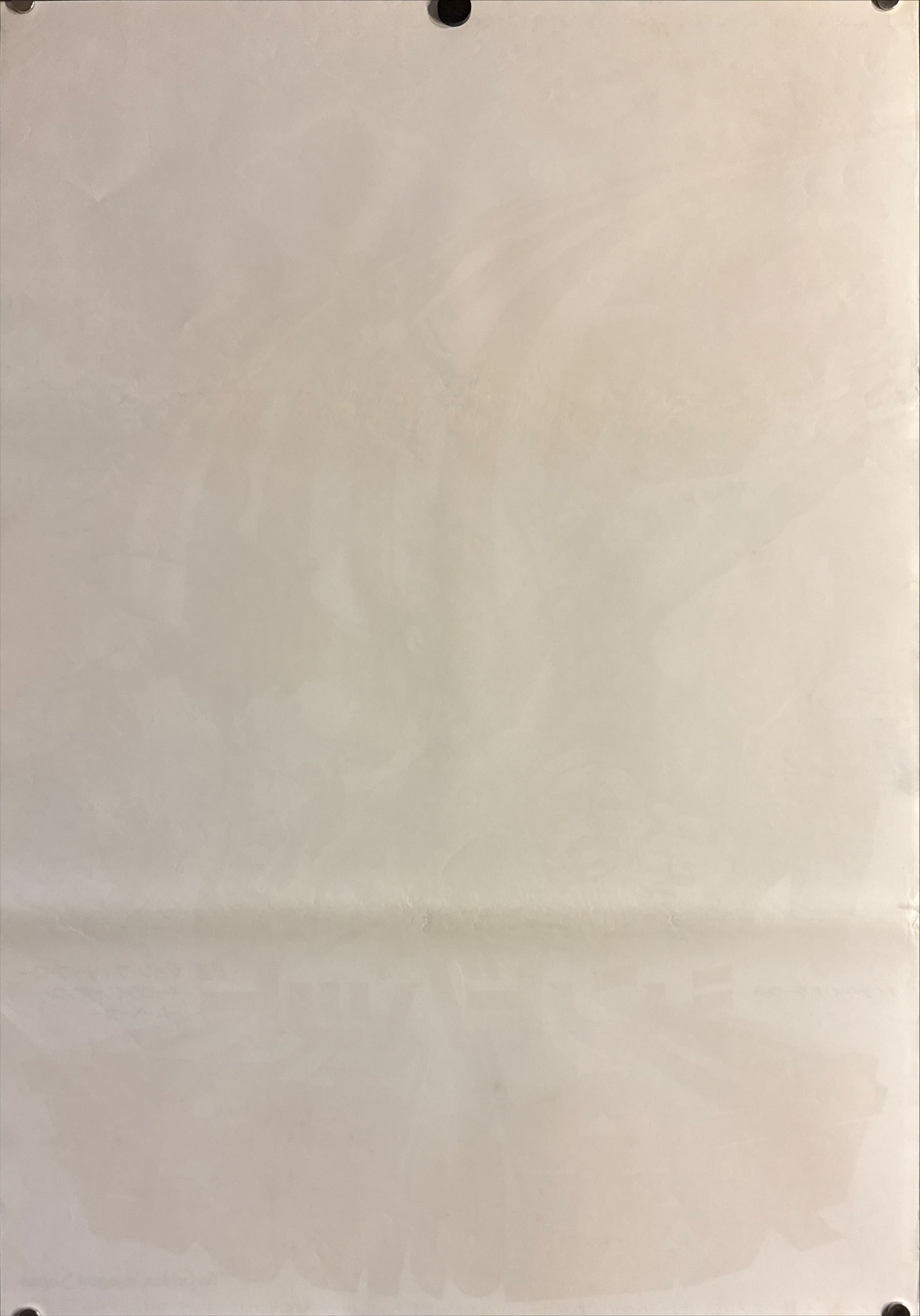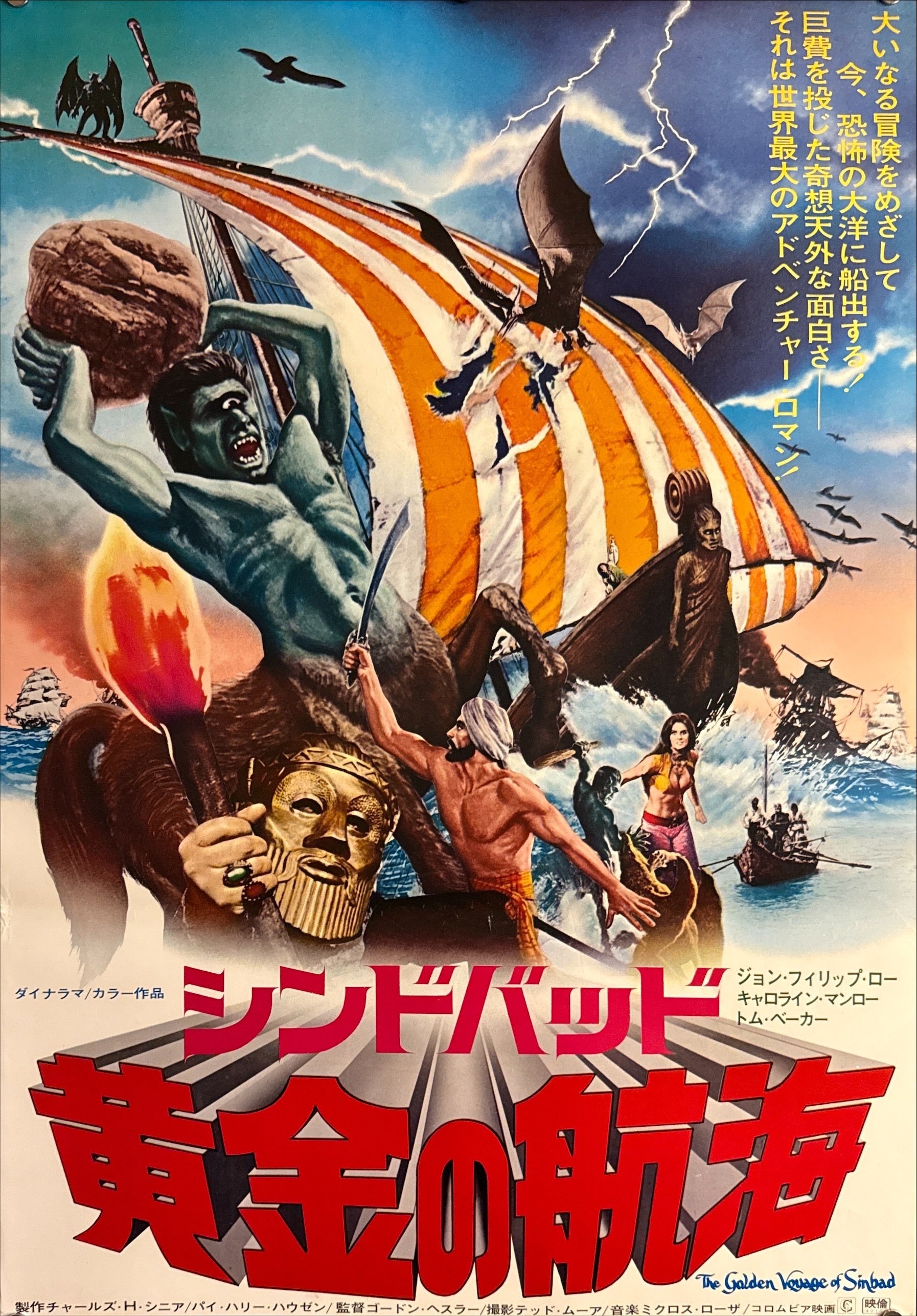 A tremendous and highly displayable Japanese design bursting with pure fantasy-adventure energy. The composition is dominated by the great striped sail of Sinbad’s ship as it cuts through stormy seas, while around it erupts a riot of Harryhausen-style wonders: a towering blue cyclops-like creature hurling a boulder, winged monsters attacking from the sky, sword-wielding heroics, a masked figure with flaming torch, sea-borne action, and the glamorous presence of Caroline Munro. The huge red Japanese title 黄金の航海 gives the sheet enormous wall impact, and the whole image perfectly captures the film’s promise of danger, magic, and exotic spectacle. It is exactly the kind of bold, painterly Japanese fantasy poster that collectors love.