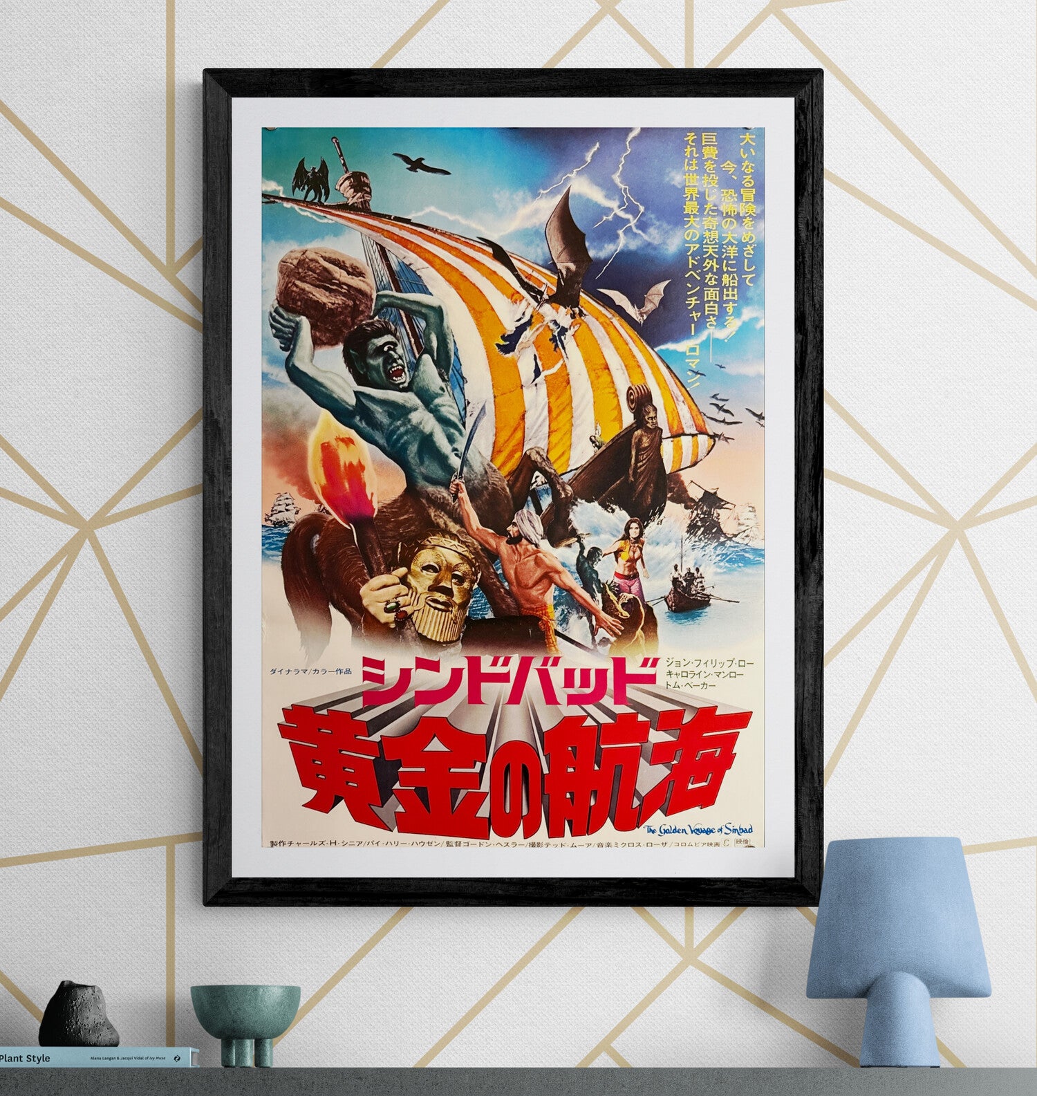 This is an original Japanese B2 poster printed in 1974 for the first Japanese theatrical release of The Golden Voyage of Sinbad, the classic fantasy adventure produced by Charles H. Schneer and featuring legendary Ray Harryhausen stop-motion effects. Released in Japan the year after its original 1973 debut, the film stars John Phillip Law, Caroline Munro, Tom Baker, and Douglas Wilmer, and remains one of the great Harryhausen-era adventure spectacles.