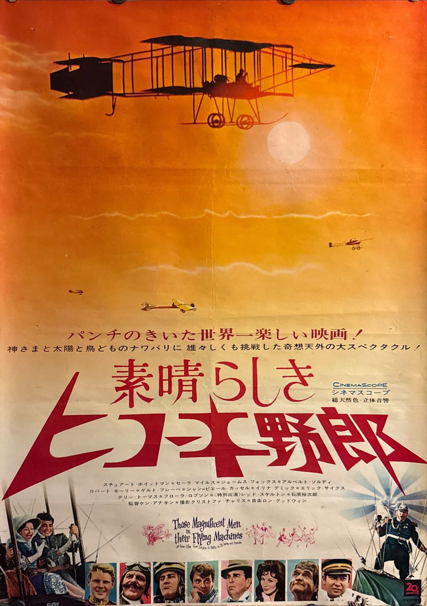 This is an original Japanese B2 theatrical poster printed in 1965 for the first Japanese release of Those Magnificent Men in Their Flying Machines, the colourful aviation adventure-comedy directed by Ken Annakin and starring Stuart Whitman, James Fox, Sarah Miles, Alberto Sordi, Robert Morley, and Terry-Thomas. This is the highly attractive Japanese Style B design, a wonderfully graphic and displayable poster for one of the great large-scale light adventure films of the 1960s.