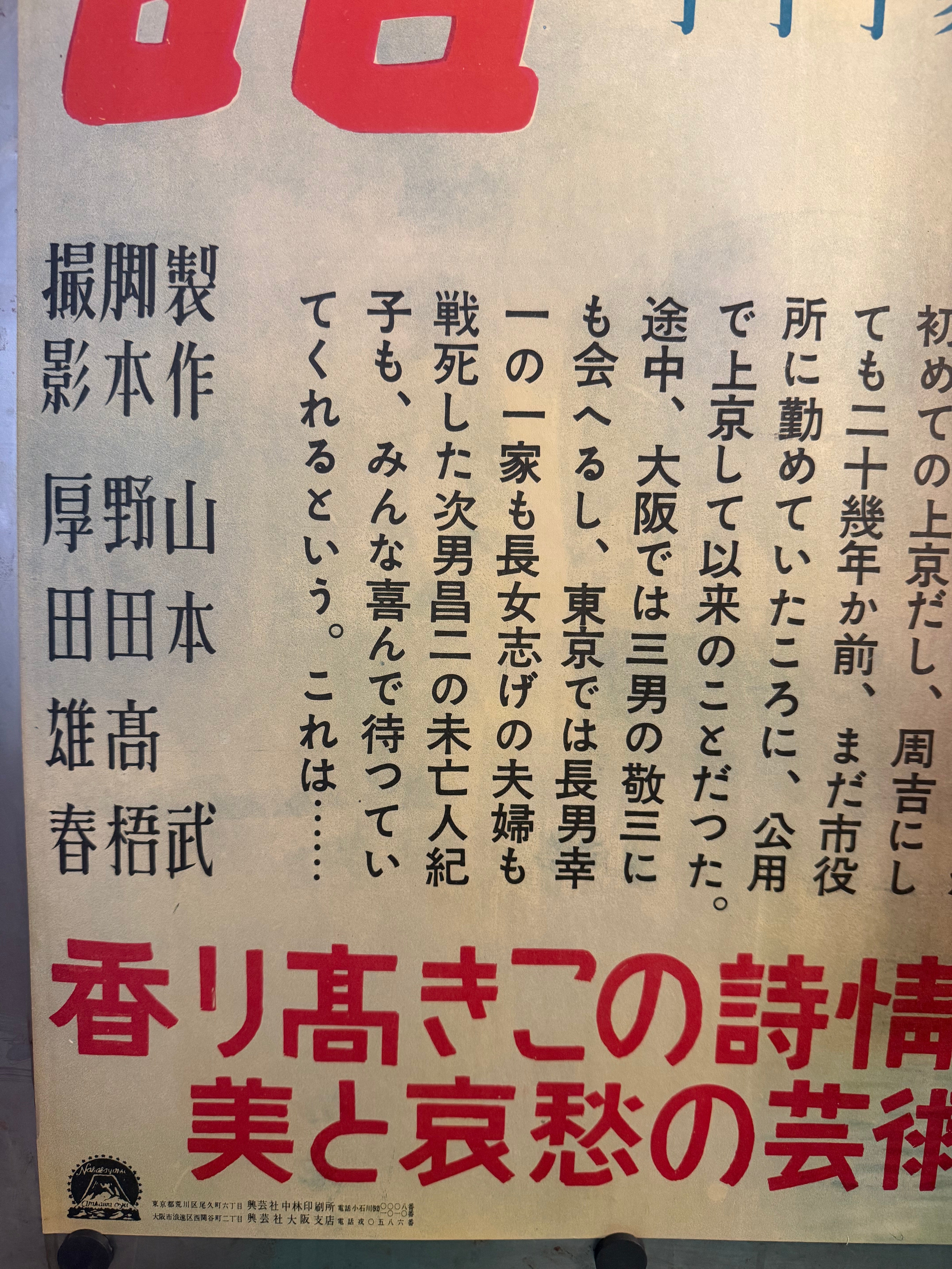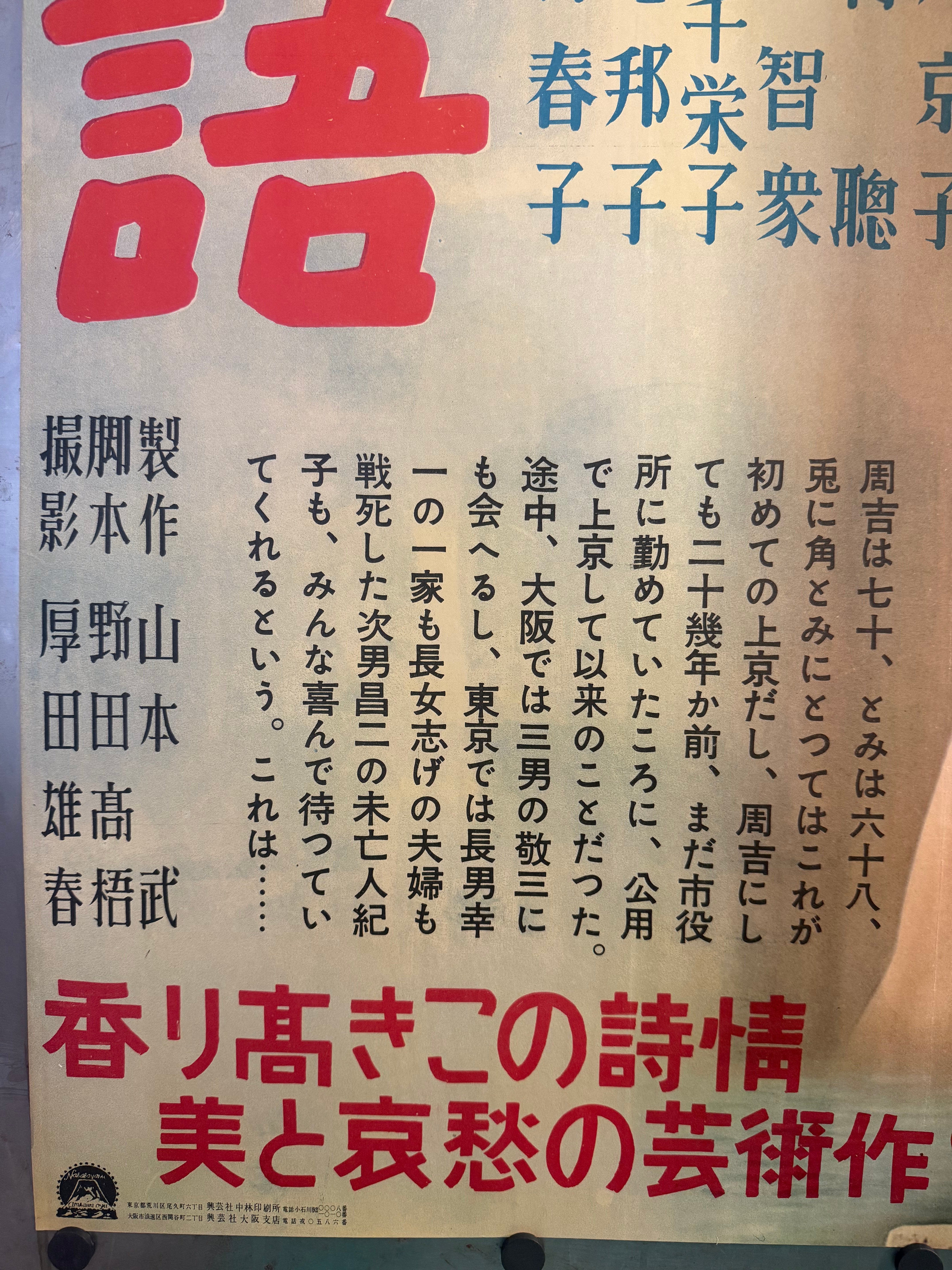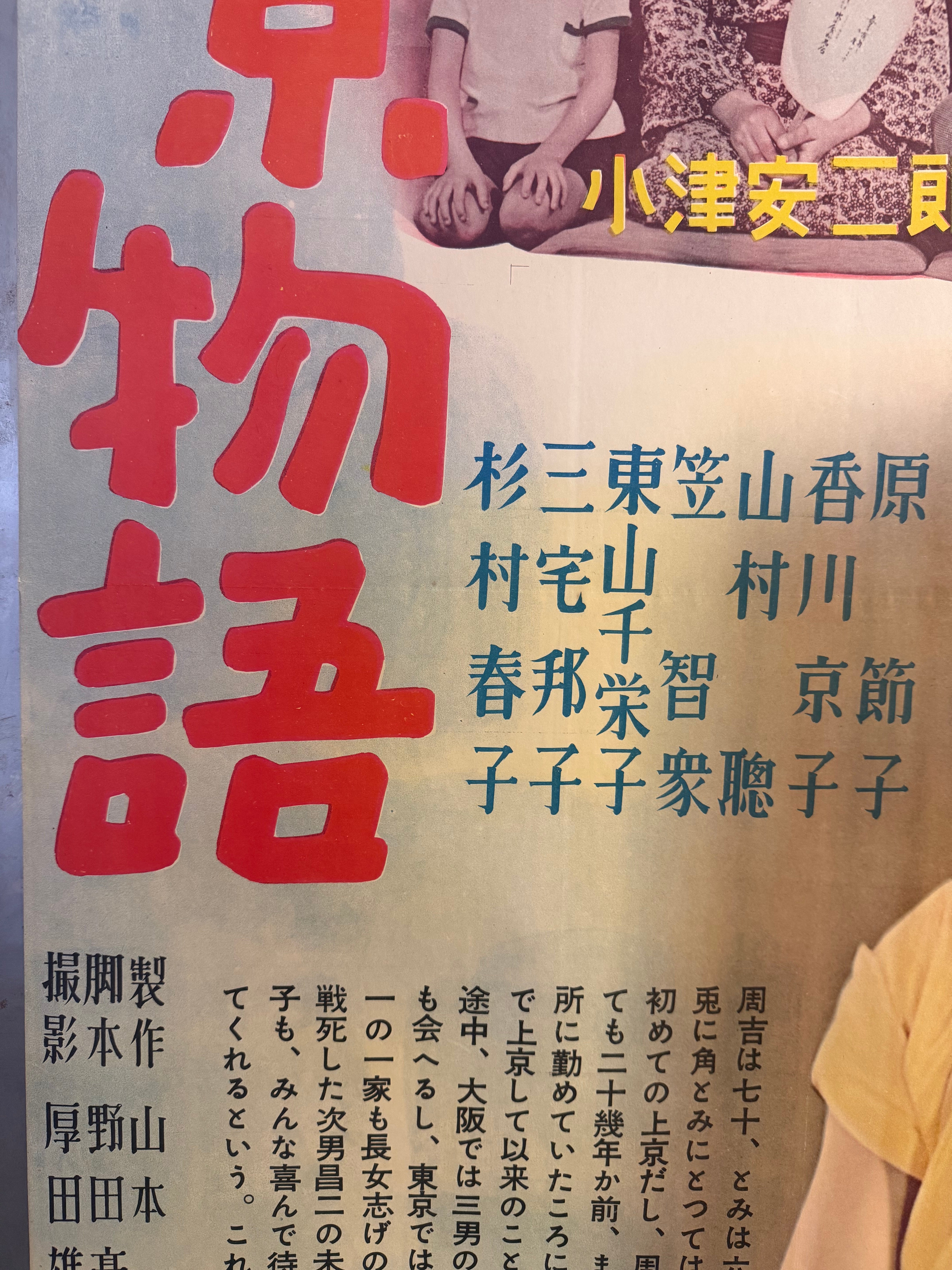 We have not found a publicly documented sale of the Tokyo Story first-release B1 in the major, searchable Western and Japanese auction archives and public listings we reviewed. We have also made detailed inquiries with the top collectors in Japan who are only aware of this exact copy which was sourced by Japan Poster Shop privately. What does surface publicly are smaller formats—notably B2.