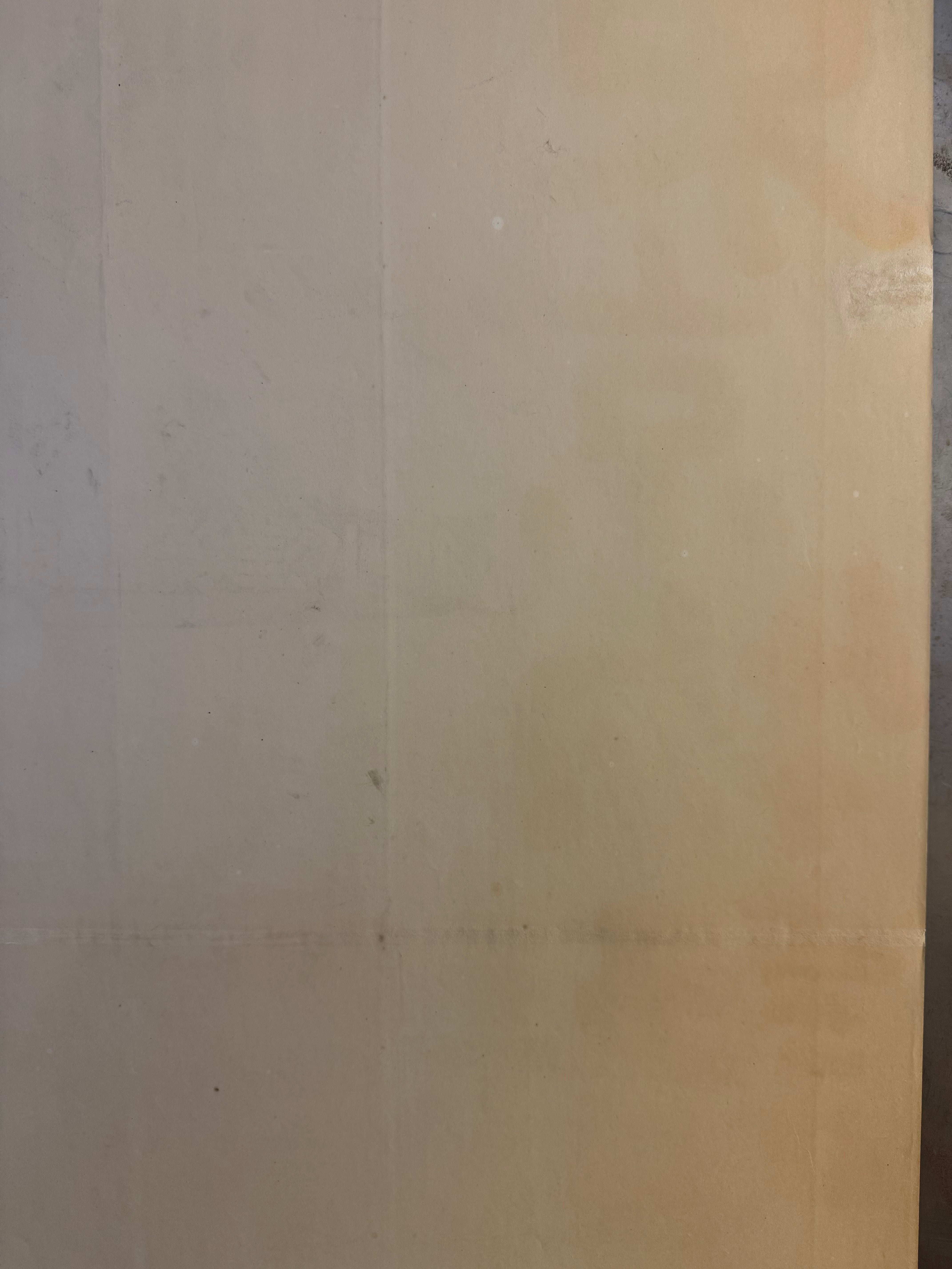 In practice, this approach typically involves thin, sympathetic Japanese papers (often kōzo-fibre washi) and carefully prepared starch paste to reinforce folds/tears while keeping the object flexible rather than brittle—resulting in a flatter, stronger poster that still respects the original paper.
