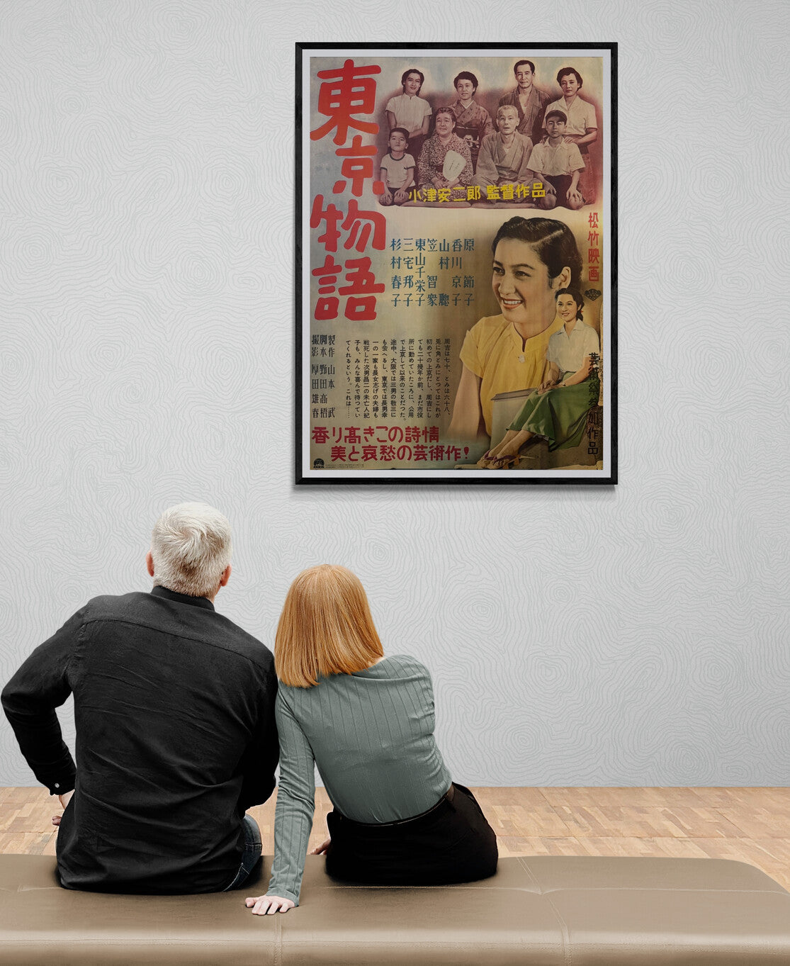 Monumental title typography: The film’s title 東京物語 is rendered in bold, oversized red characters running vertically—graphic, immediate, and unmistakably Japanese in its visual authority.
