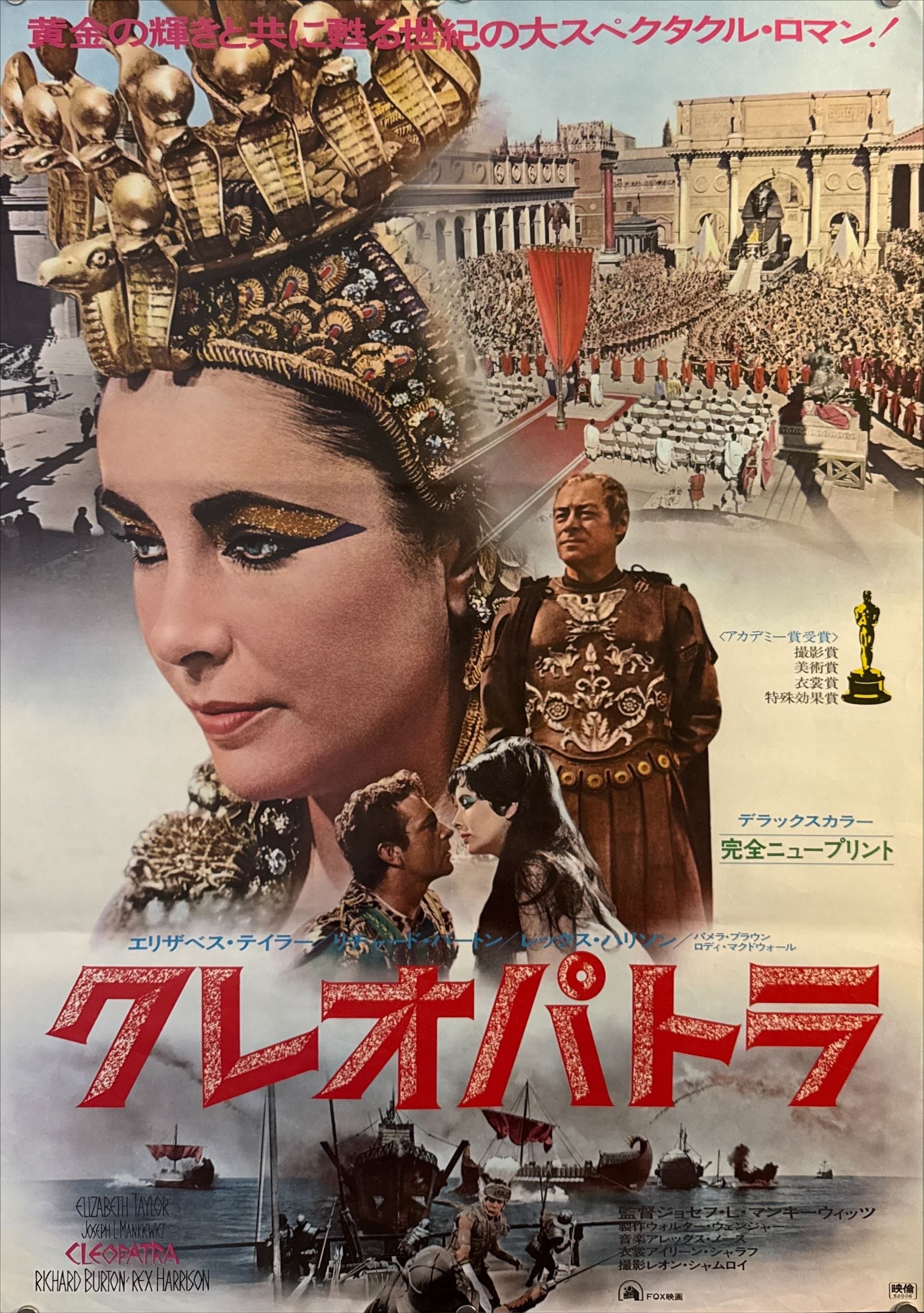 A grand, romance-forward montage: Taylor’s jeweled profile and cobra diadem dominate the left field while Roman pageantry, naval warfare, and the central trio (Taylor–Burton–Harrison) unfold across the right. The monumental red Japanese title 「クレオパトラ」 anchors the base above Fox credits; an Eirin code appears at lower right—sumptuous, prestige imagery befitting the film’s scale.