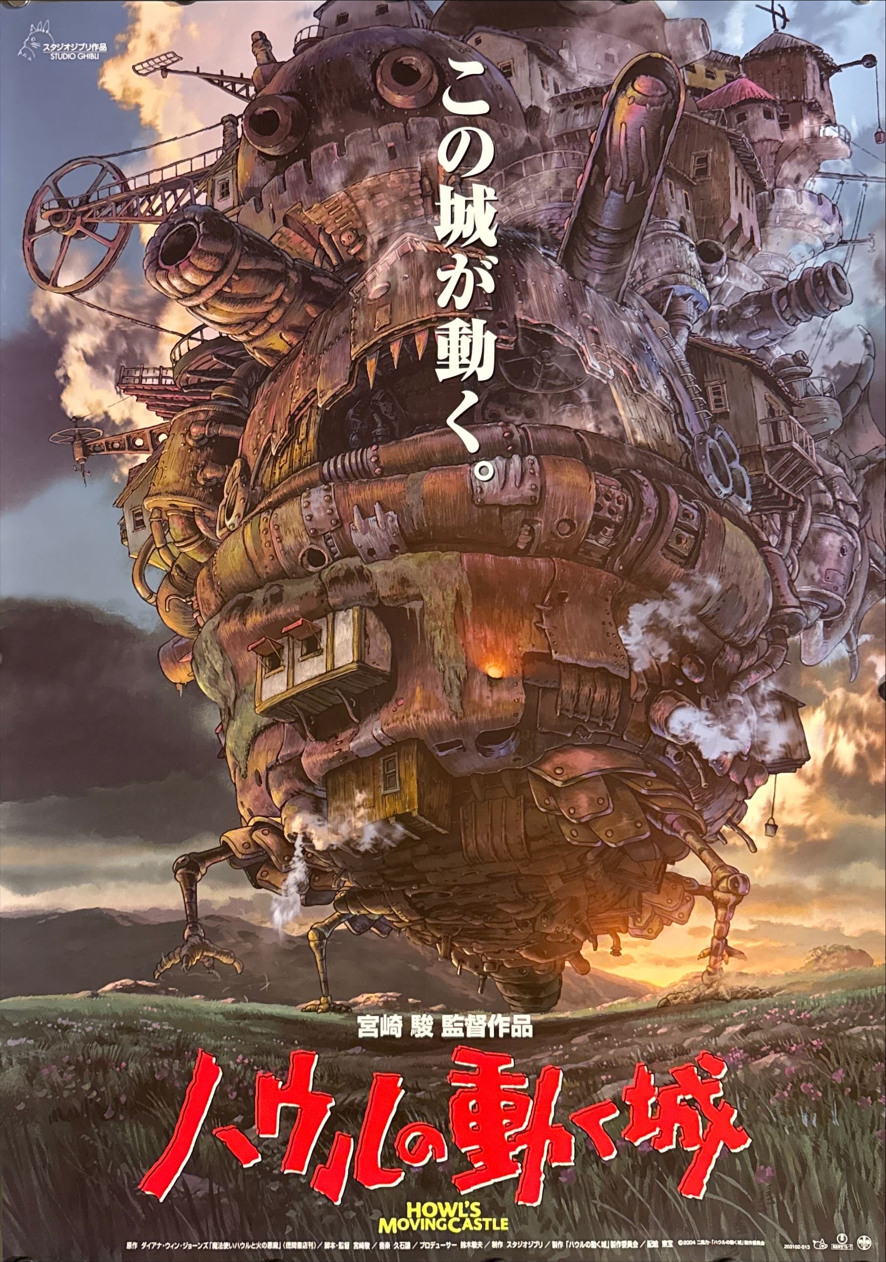 A spectacular, detail-rich key visual showcasing Miyazaki’s steampunk imagination at full power. The towering “castle” dominates the sheet—an impossible, patchwork machine of riveted metal, smokestacks, cannons, boilers, chimneys, ladders, pipes and tiny windows—walking on spindly mechanical legs across an open field beneath a dramatic sky. Warm sunset light catches the rusted plates and brass fittings, while curls of steam and smoke suggest constant motion and internal life. The elegant vertical Japanese tagline 「この城が動く。」 (“This castle moves.”) floats down the centre like a spell, and the bold red title 「ハウルの動く城」 anchors the bottom with strong theatrical impact. An exceptionally frame-friendly Ghibli design—dense with texture, yet perfectly balanced and instantly recognisable.