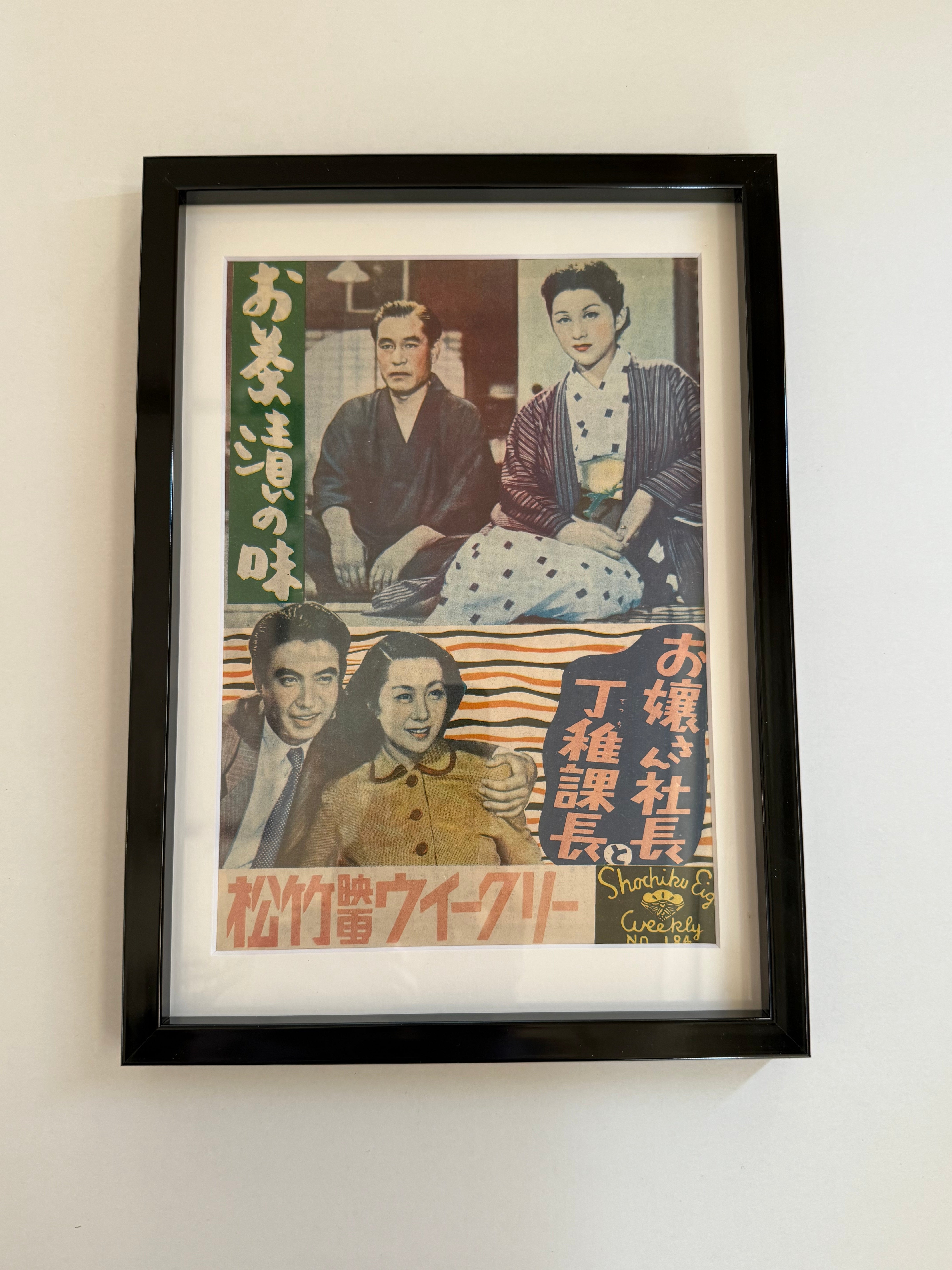 The artwork has been professionally presented in a cream-colored mount with a dark brown frame, complementing the cover’s bold, mid-century Shochiku design fantastically. Extremely rare and in demand by collectors of Yasujiro Ozu and classic Japanese film ephemera, this is an exceptional display piece that suits an office desk, a home collection wall, or makes a truly distinctive gift (for family, a friend… or yourself).