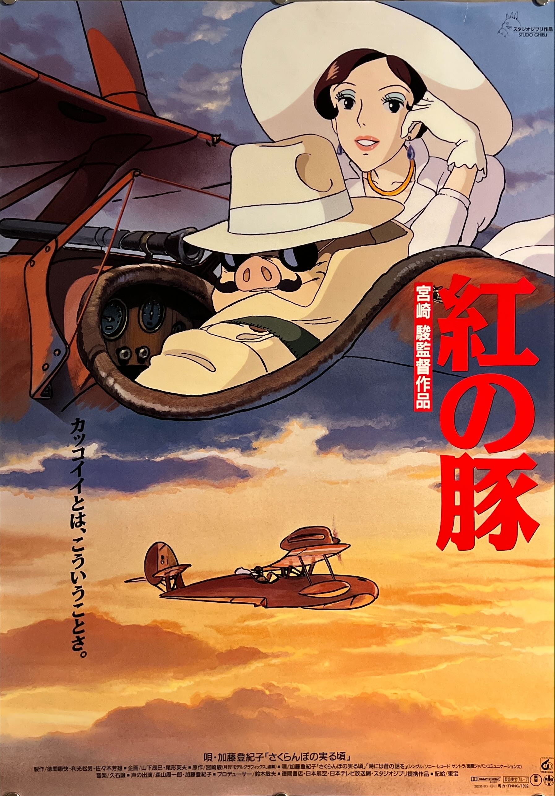 This is an original Japanese B2 poster printed in 1992 for Hayao Miyazaki’s Studio Ghibli classic Porco Rosso (Kurenai no Buta). Set over the Adriatic in the 1920s, the film follows the gentleman-rogue ace Porco—a cursed pilot with a pig’s face—through sky-pirate skirmishes, café romances, and elegiac reflections on flight and freedom.