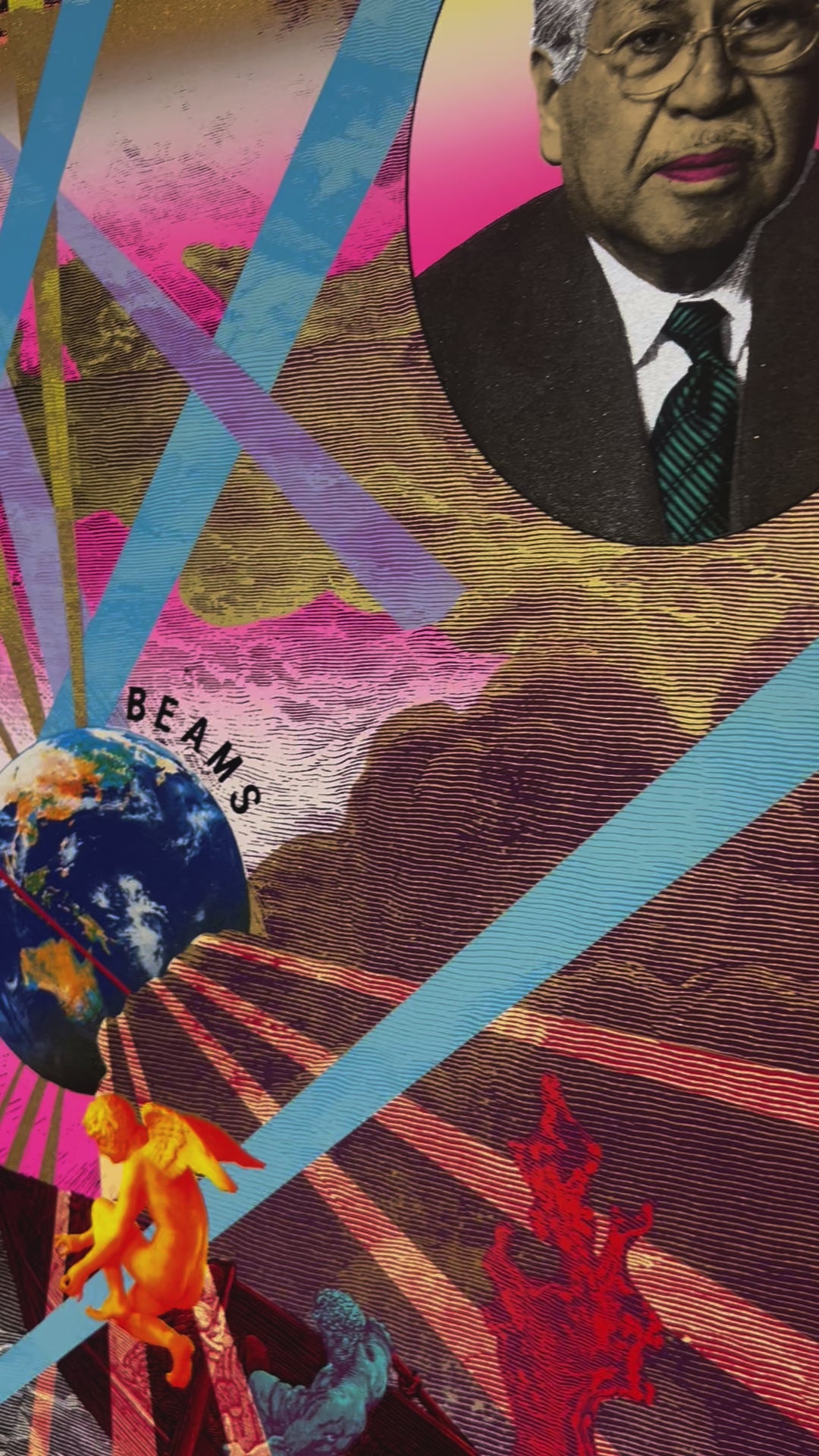 At the center, the brand’s name, "BEAMS," hovers above its logo—an image of Earth encircled by a planetary ring. Elements from Western art history, including an angel, Cupid, and sailors navigating stormy seas, appear to be drawn toward the logo, symbolizing the brand’s gravitational pull. Radiant beams of yellow, blue, purple, and pink emanate from the clouds, the Earth, and Shitara Yo, alluding both to the brand’s name and the iconic Japanese rising sun symbol.