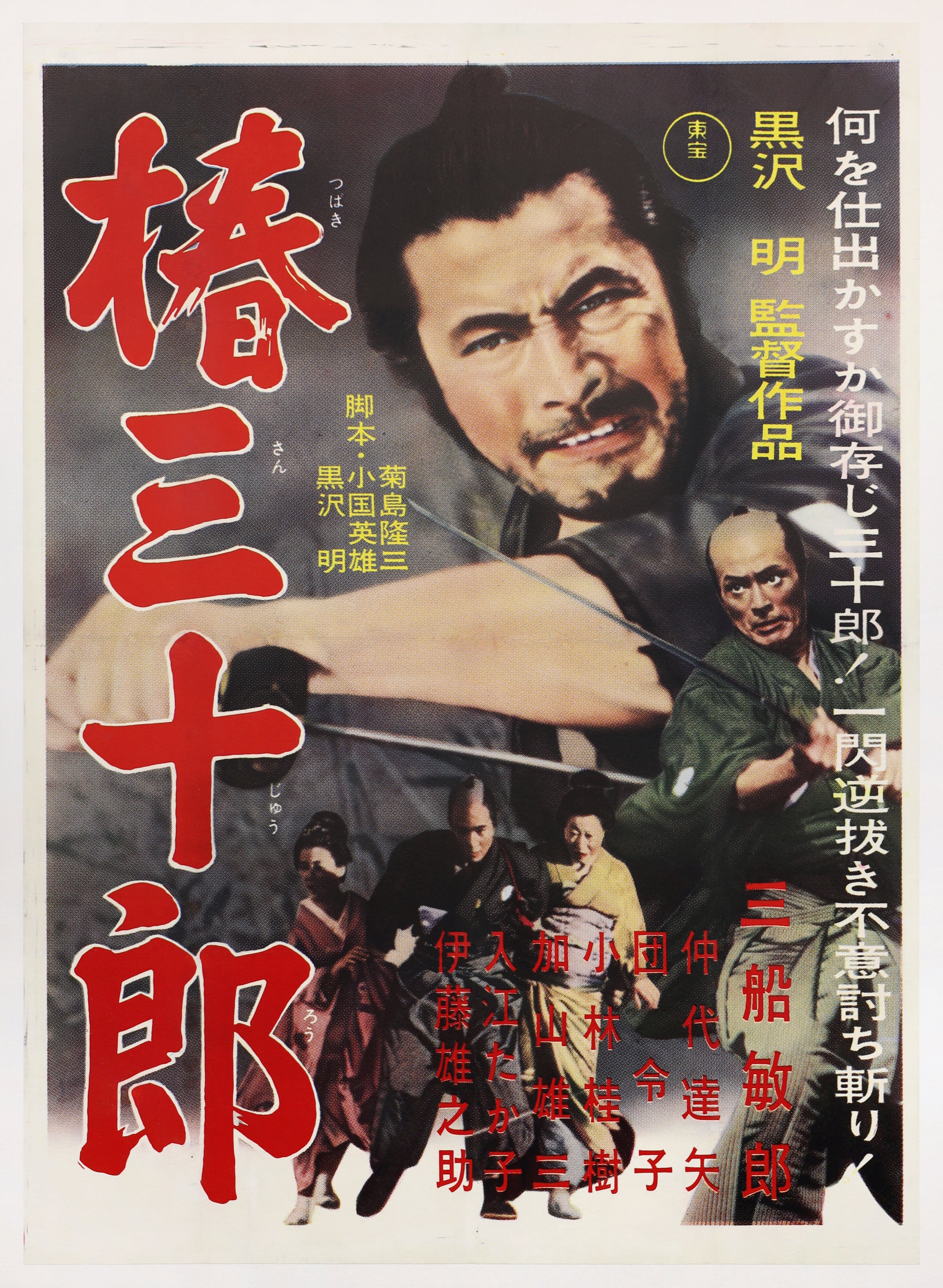 Typography: Giant red calligraphic 椿三十郎 with reading marks; vertical yellow 「黒沢 明 監督作品」 credit at right; screenplay credits 菊島隆三/小国英雄/黒沢明 at left; cast block at lower right beginning 三船敏郎/仲代達矢.