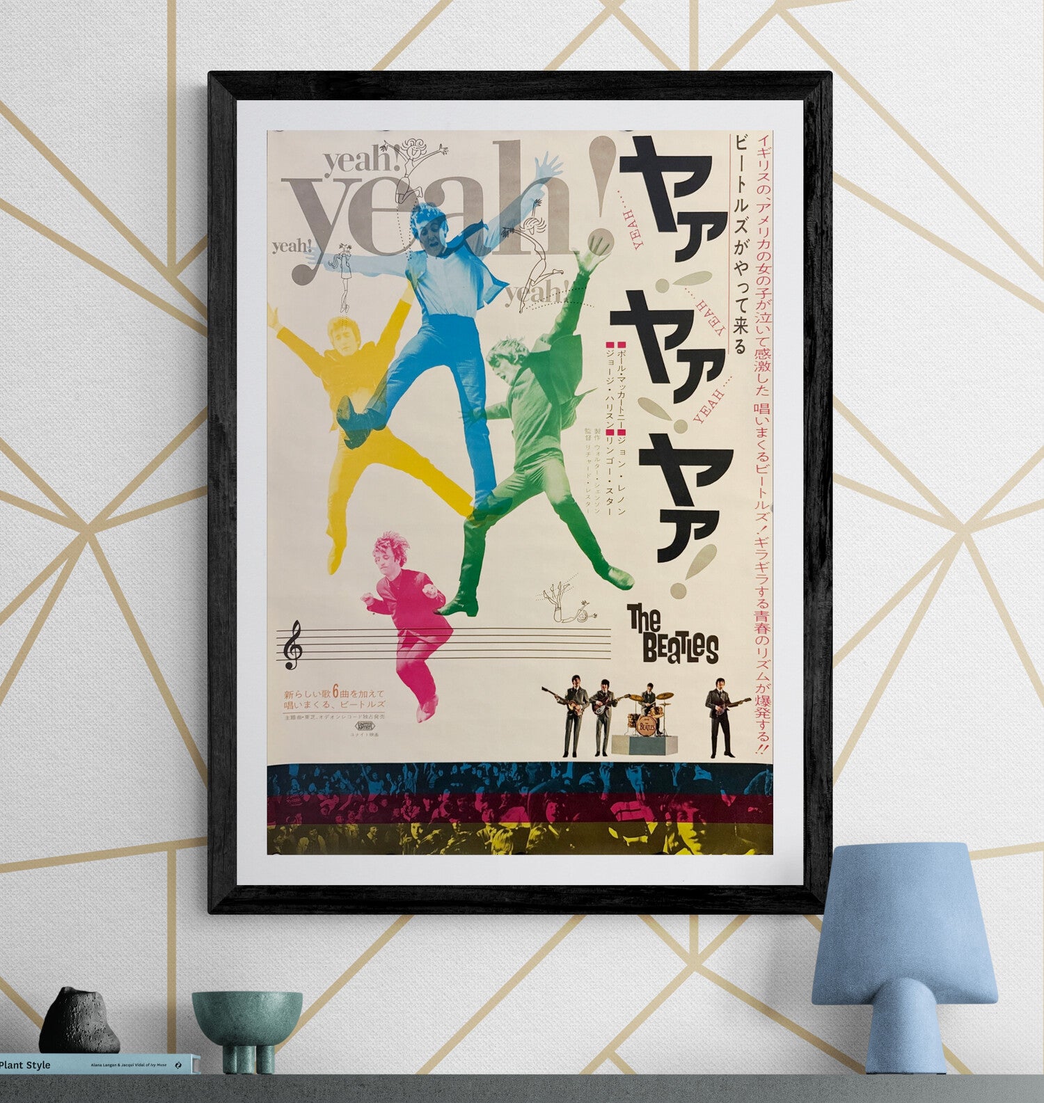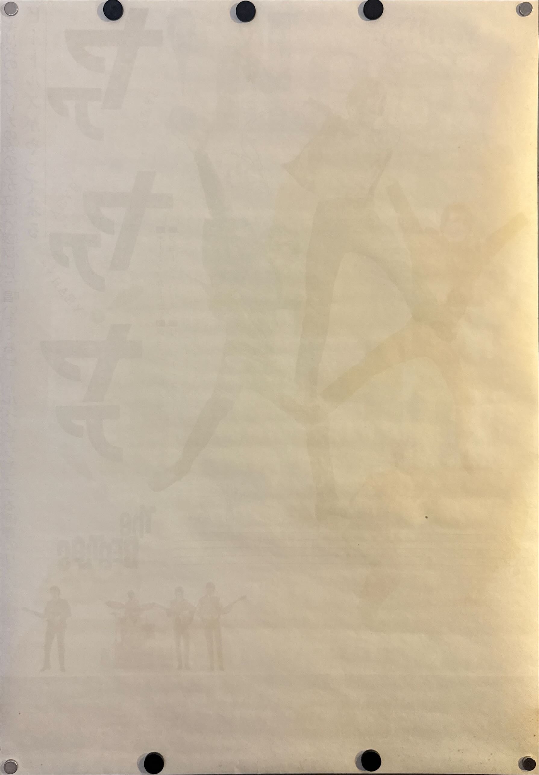 This Japanese B2 bursts with energy worthy of the film. The central image shows the Fab Four leaping mid‑air, each figure tinted a different bright colour—yellow, blue, green and magenta—against a pale background. Oversized grey and black “yeah! yeah! yeah!” typography dances across the sheet, echoing the film’s Japanese marketing title. Small line‑drawn doodles and musical staff details add a playful, graphic touch, while a tiny full‑band photo and a strip of multicoloured crowd imagery run along the bottom. It’s a joyous, kinetic design that perfectly evokes 1960s pop exuberance.