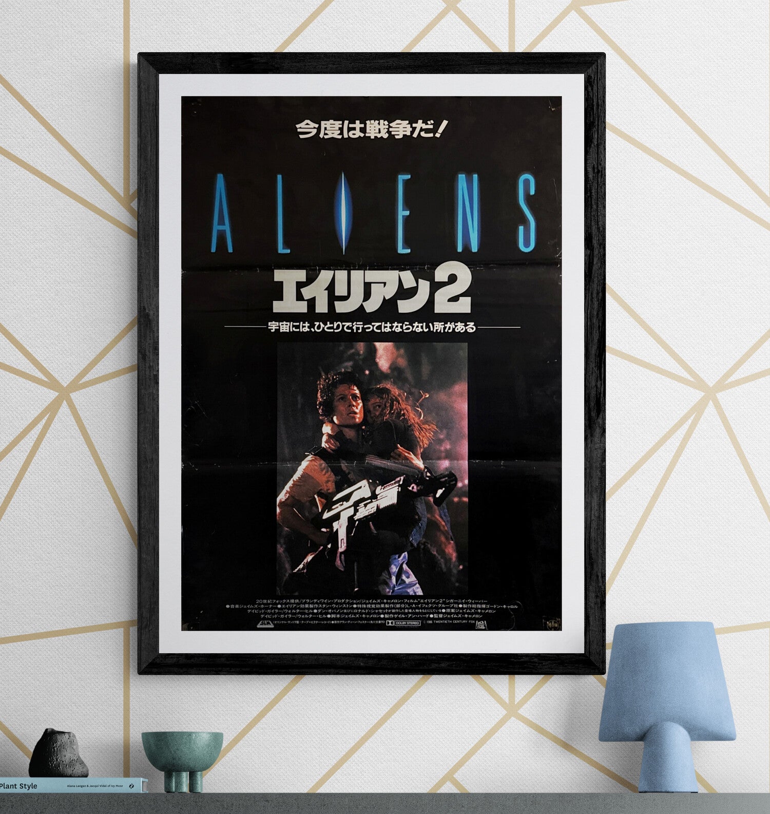 A bold, high‑contrast campaign piece: deep black field, the iconic electric‑blue ALIENS wordmark, and a central production image of Ripley protecting Newt—clean, dramatic, instantly readable from across a lobby. The Japanese tagline “今度は戦争だ!” (“This time it’s war!”) anchors the tone perfectly. As a fun piece of poster lore, Cameron has even joked about the film’s early poster concept being essentially an all‑black frame dominated by the title treatment—this B2 keeps that minimalist punch while adding the emotional core image.