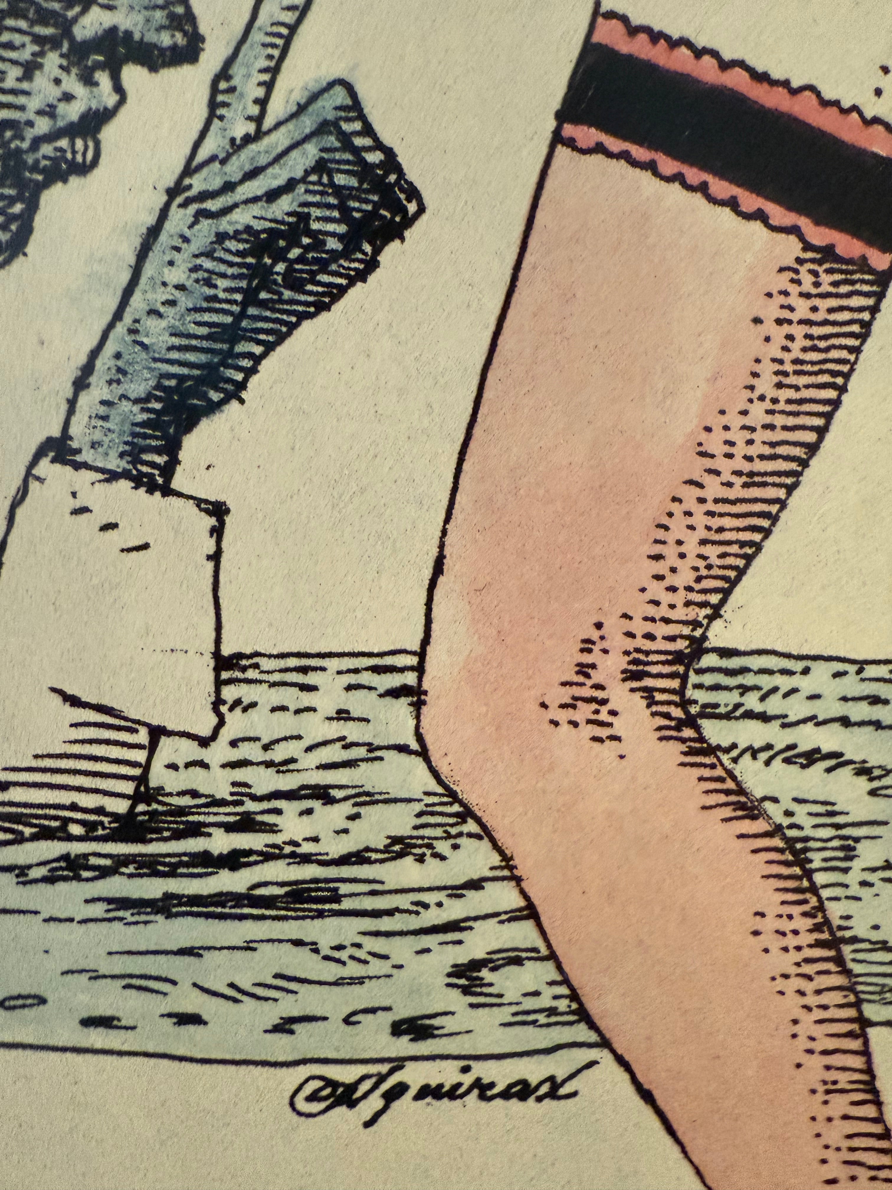 Cabaret‑noir tableau. A bow‑hatted showgirl in polka‑dot leotard and stockings strides past a watery pool, while a monocled gent brandishes twin glass eyes; at upper right a framed ENOKEN portrait winks to 1930s revue culture. Uno’s wiry pen lines and powdery washes sit on a warm kraft ground.