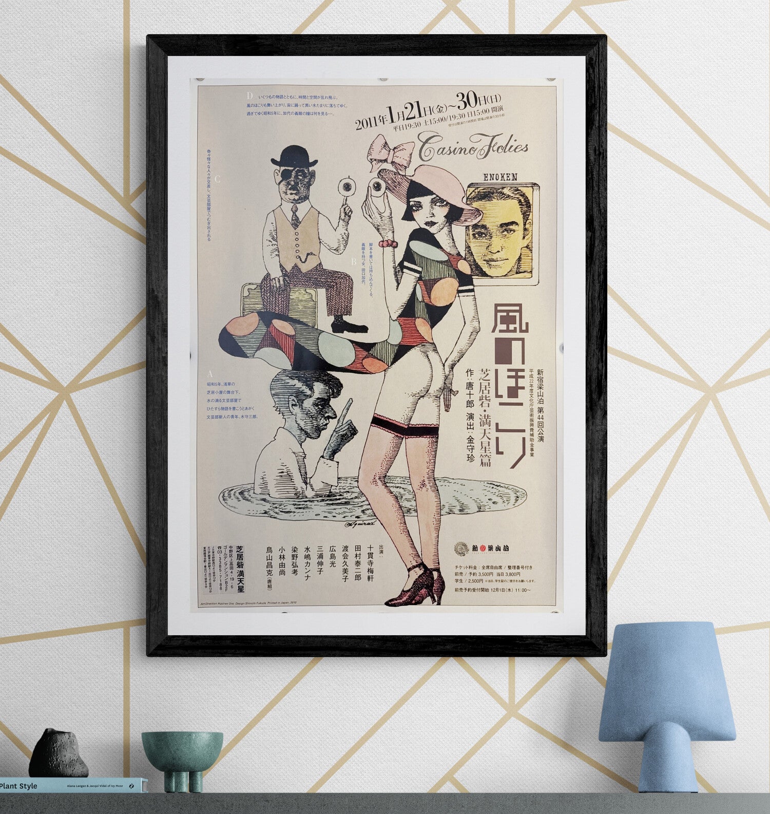 This B2 sheet is a scarce Ryōzanpaku poster for Kaze no Hokori. Uno’s “Aquirax” signature appears in the image (by the figure’s calf). Credits read along the bottom margin: Art Direction Aquirax Uno / Design Shinichi Fukuda / Printed in Japan, 2010. Uno’s theatre graphics are widely collected and exhibited.