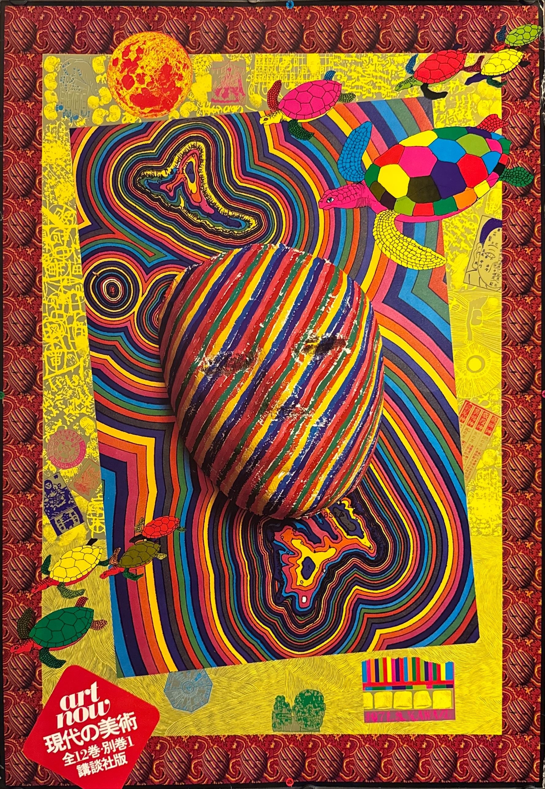 A dazzling, tactile psychedelic mandala: concentric rainbow bands ripple like topographic rings around a sculpted striped mask that seems to bulge from the surface. Multicolored sea turtles swim through a yellow border teeming with glyphs and talismans, while a small cartouche at the base reads “1971.8 KAWAZU” (printed within a striped, shrine-like motif). The lower-left badge carries the series mark “art now / 現代の美術 全12巻・別巻1 講談社版.” Awazu’s dense patterning, fluorescent palette, and collage relief produce a hypnotic, museum-grade poster.