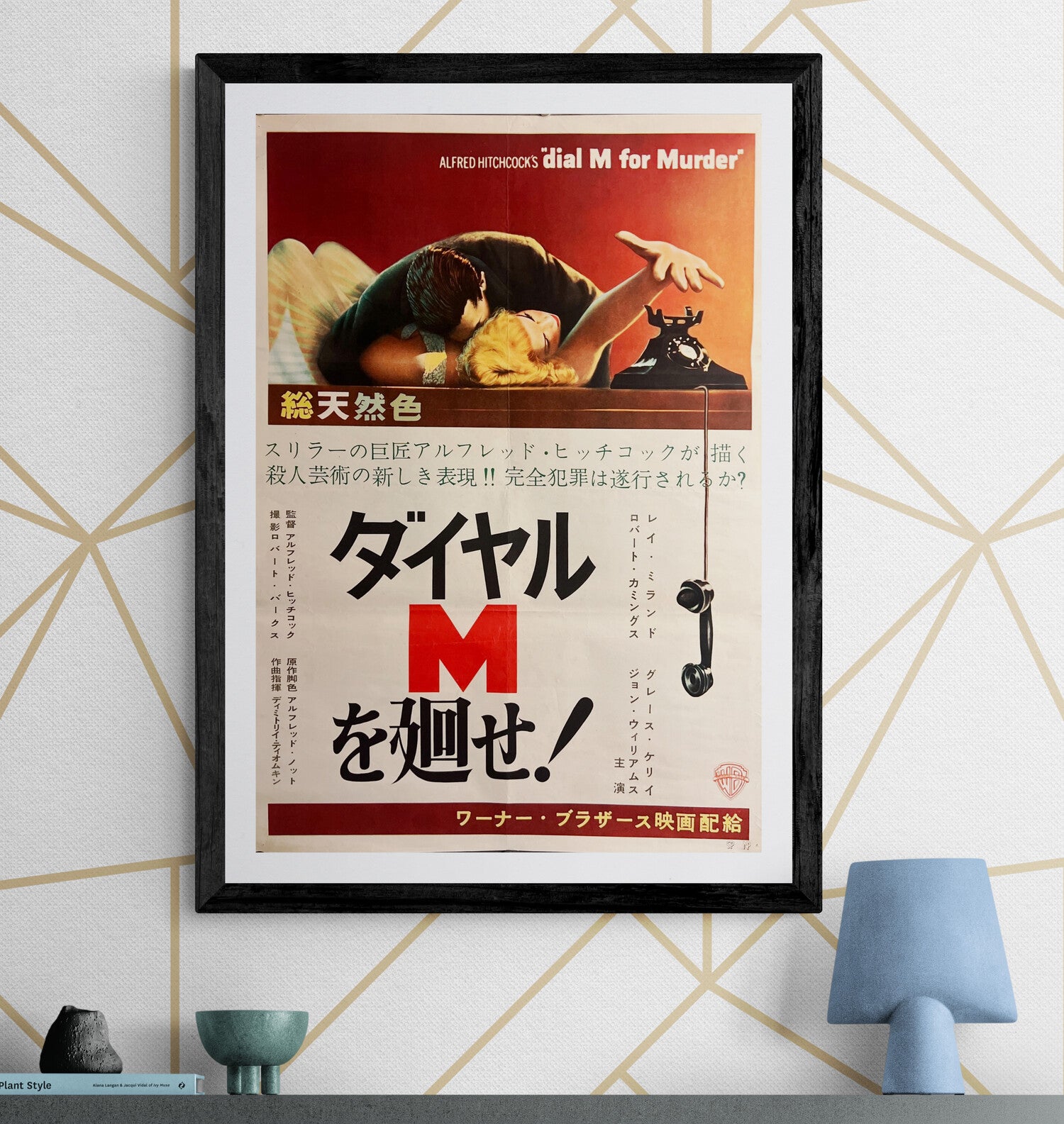This is an original Japanese theatrical poster printed in 1954 for the first domestic release of Alfred Hitchcock’s Dial M for Murder (『ダイヤルMを廻せ!』), the master’s ingenious adaptation of Frederick Knott’s hit stage play, starring Ray Milland, Grace Kelly, Robert Cummings and John Williams. Shot in stereoscopic 3‑D for Warner Bros. at the height of Hollywood’s first 3‑D boom, the film opened in the US on 29 May 1954 and reached Japanese cinemas on 27 October 1954, distributed by Warner Bros. Japan. Combining drawing‑room mystery, meticulously engineered suspense and one of Kelly’s defining performances, it remains a benchmark of Hitchcockian precision and is now widely acknowledged as a sophisticated, unnerving thriller.