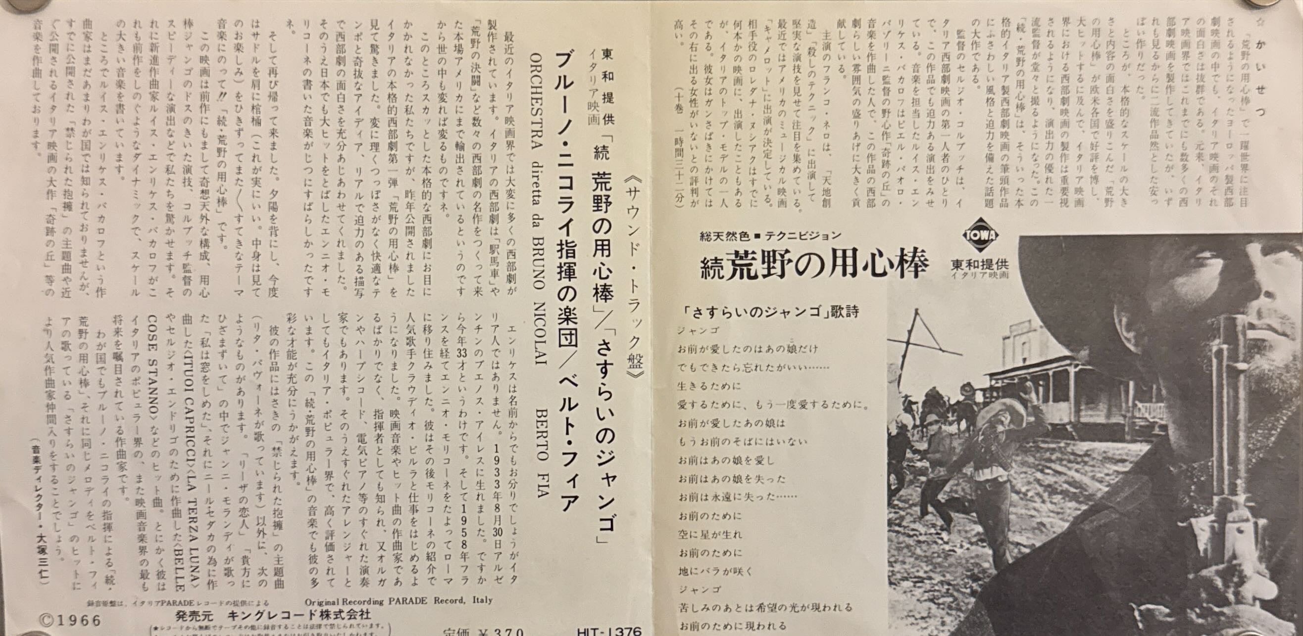 In Japan the film opened on 23 September 1966 under the title 続・荒野の用心棒 (Zoku Kōya no Yōjinbō, literally “Continuation: The Bodyguard of the Wilderness”), marketed as both a reinterpretation of Yojimbo and an unofficial follow‑up to A Fistful of Dollars, which had been released locally as 荒野の用心棒. The theme song “Django”, composed by Luis Bacalov with lyrics by Franco Migliacci and Robert Mellin and conducted by Bruno Nicolai, became one of the most recognisable Western themes of the era and was issued in multiple single versions, including Japanese pressings promoted with materials like this very sheet.