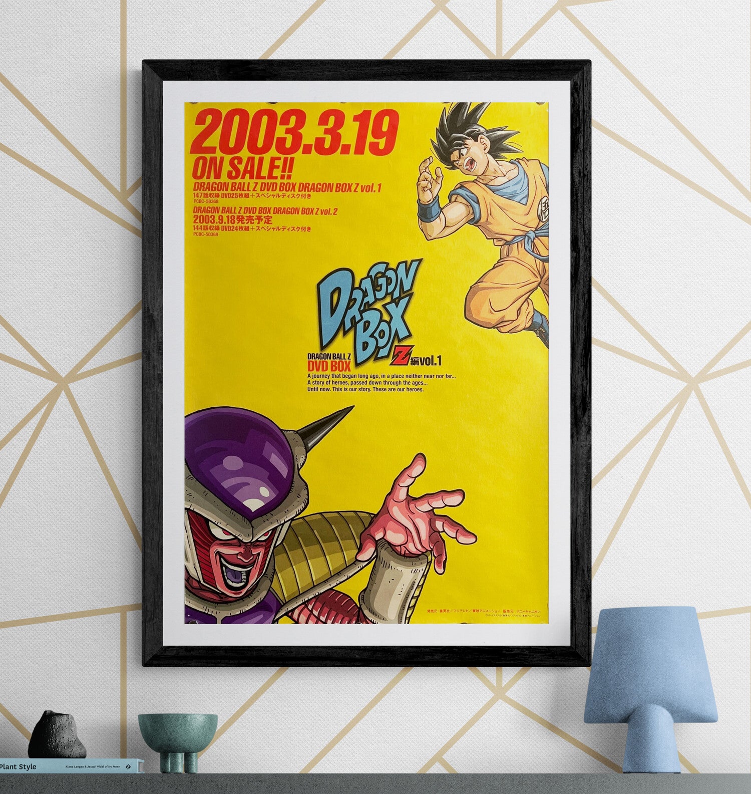 A bold, minimalist, high-impact design that lets the characters do the talking. Set against a saturated gold/yellow field, the composition balances Goku (upper right, mid-action) against Frieza (lower left, reaching forward), creating a dynamic diagonal tension across the empty space. The centre is anchored by the “DRAGON BOX” logo with Z編 vol.1, and the oversized red release date headline “2003.3.19 ON SALE!!” makes it instantly readable from across a room. Clean, graphic, and extremely frame-friendly—this is a perfect poster for Dragon Ball collectors who prefer official, design-forward promo material rather than standard character collages.
