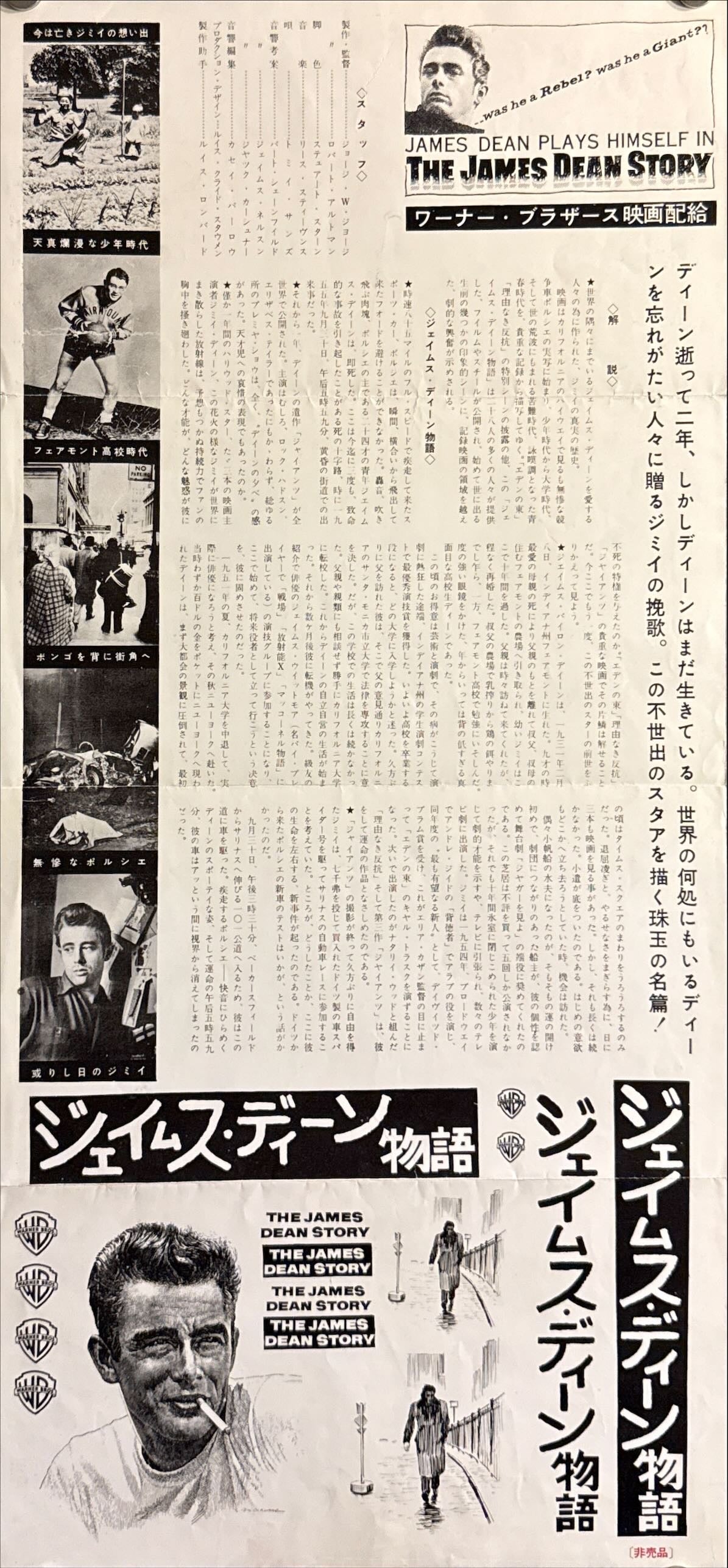 “The James Dean Story” (ジェームス・ディーン物語), Original 1957 Japanese speed poster / press sheet (Not For Sale / 非売品) for the first Japanese release — Size: c. 25 × 52 cm O532