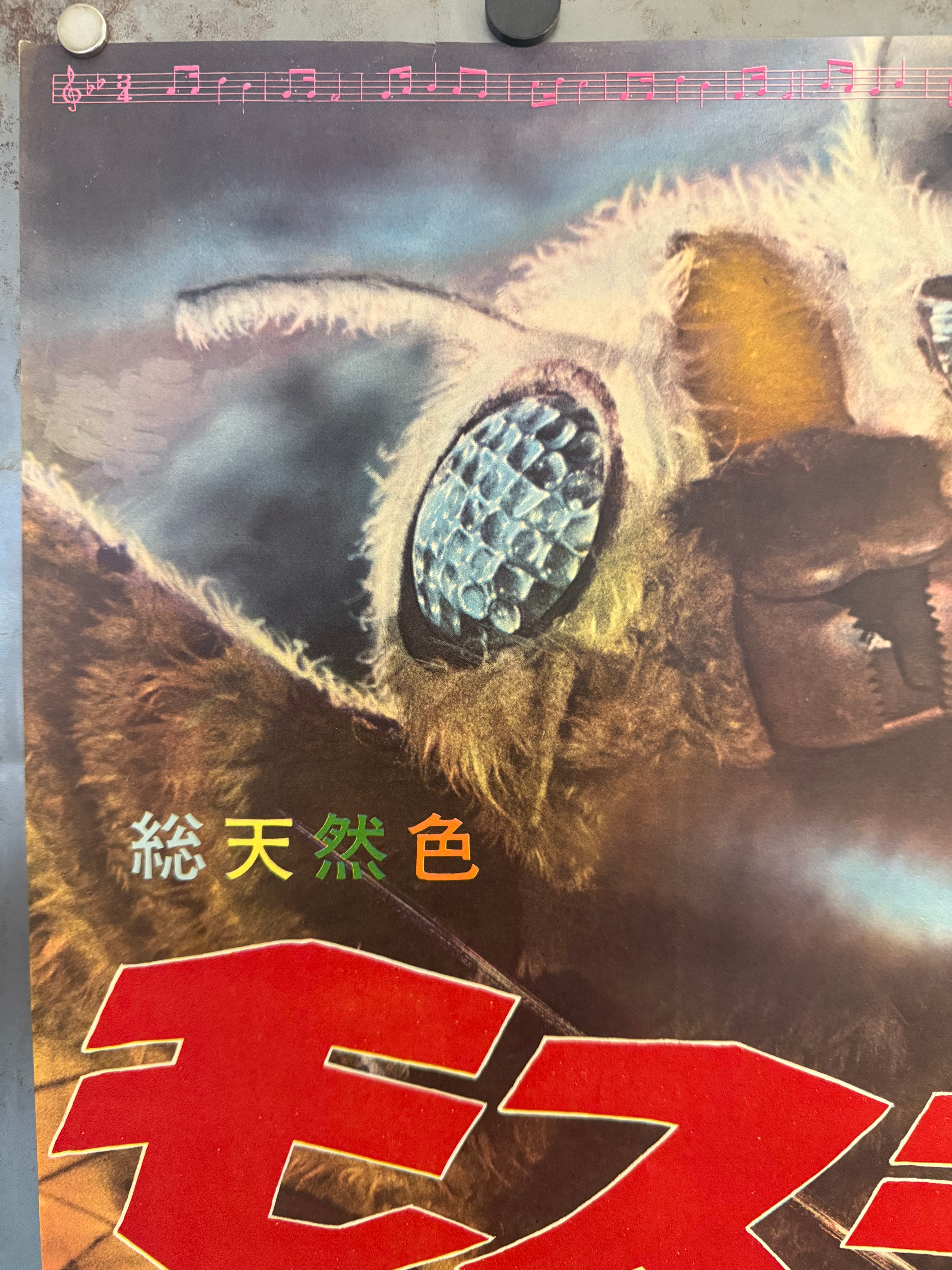 This is an original Japanese B2 poster printed in 1964 for Ishirō Honda’s Mothra vs. Godzilla—exported in the West as Godzilla vs. the Thing. A peak Shōwa-era entry, it unites Honda’s direction, Eiji Tsuburaya’s groundbreaking tokusatsu effects, and Akira Ifukube’s thunderous score. Starring Akira Takarada, Yuriko Hoshi, Hiroshi Koizumi, and the singing duo The Peanuts (as the Shobijin), the film is a fan-favorite that helped cement Mothra as Godzilla’s noblest rival and ally.
