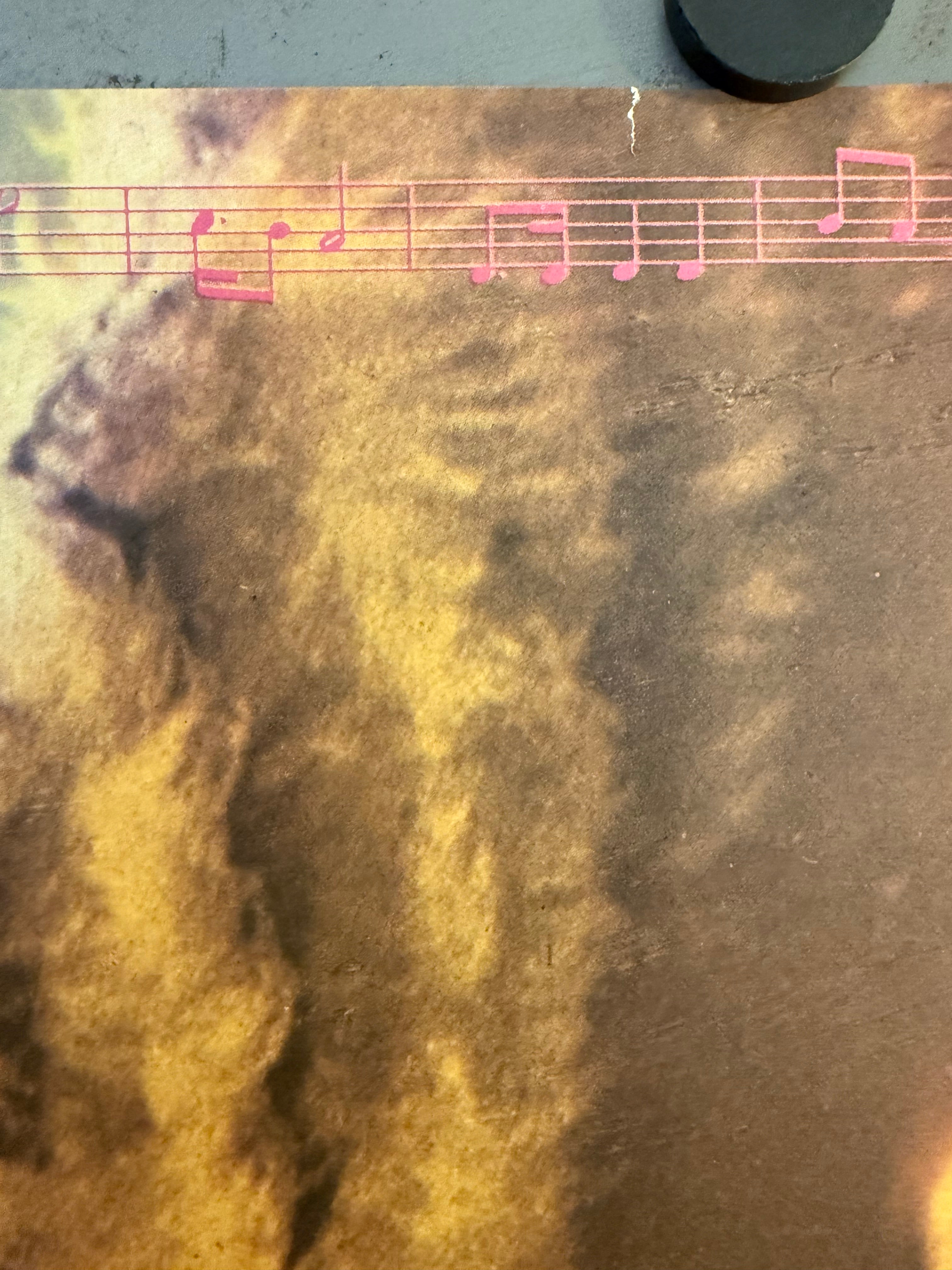 A dynamic photo-montage built around a full-wing Mothra vs. Godzilla clash: Mothra’s compound eyes and fur fill the upper field while Godzilla counters with an atomic blast. A festive neon-pink musical staff borders the sheet—an allusion to the Shobijin’s summoning song—while the huge scarlet title 「モスラ対ゴジラ」 is slashed across the center with the yellow 対 tile. At lower left, the export caption “GODZILLA AGAINST MOTHRA” appears; the Toho roundel sits at the upper right. Credits list Honda (監督), Tsuburaya (特技監督), and principal cast; footer line reads © 1964 TOHO CO., LTD. / Printed in Japan. The upper left bears 総天然色 (Eastmancolor).