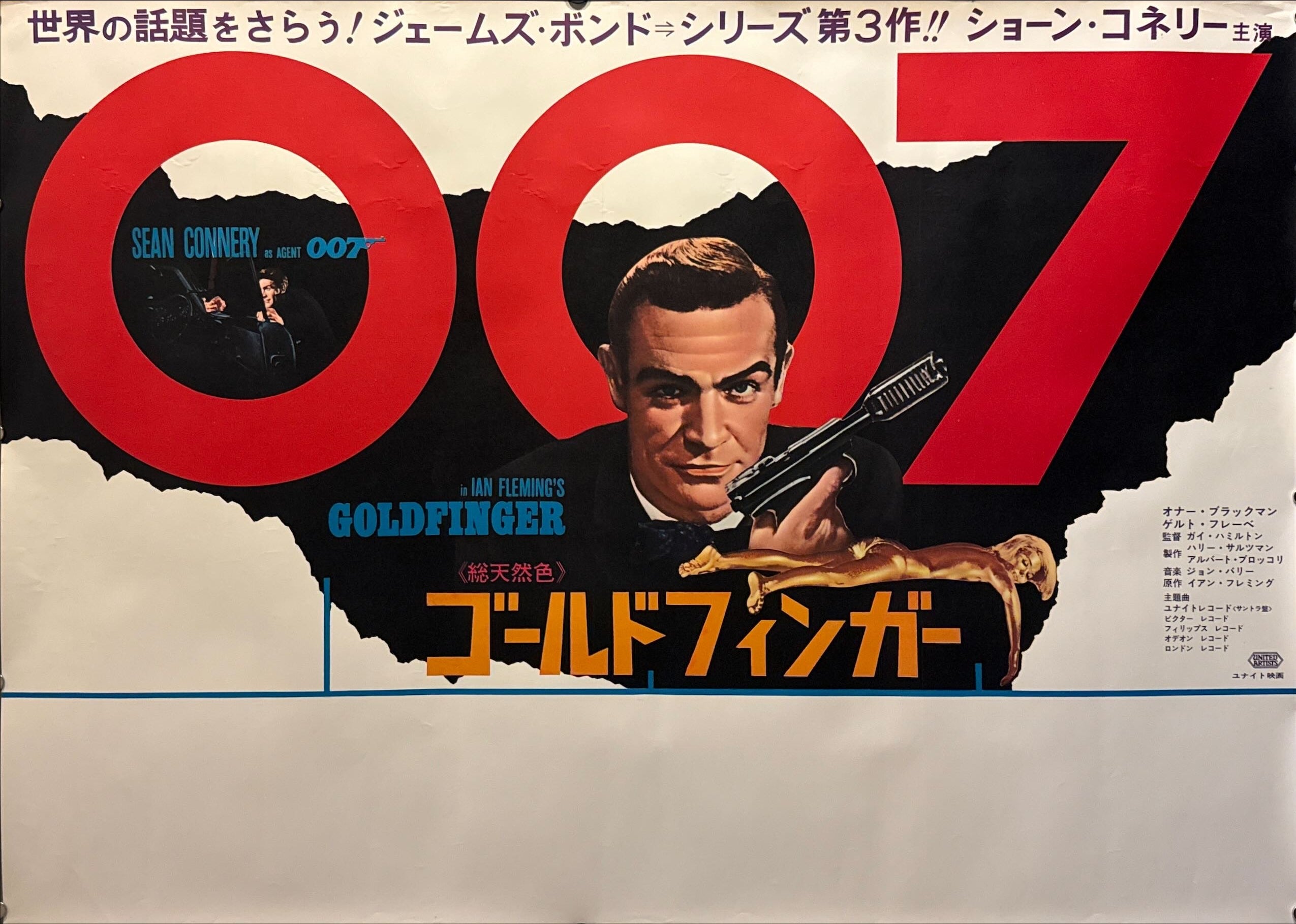 This is an original Japanese B1 poster printed for the first Japanese theatrical release in 1965 of Goldfinger (007/ゴールドフィンガー), Guy Hamilton’s third 007 film starring Sean Connery with Honor Blackman, Gert Fröbe, Shirley Eaton and Harold Sakata; music by John Barry. Japan opened the film 1 April 1965, following its 1964 UK/US premieres. Goldfinger became the first Bond film to win an Academy Award (Best Sound Effects/Editing) and cemented the series’ formula—Q‑branch gadgets and the debut of the Aston Martin DB5—now central to Bond iconography.