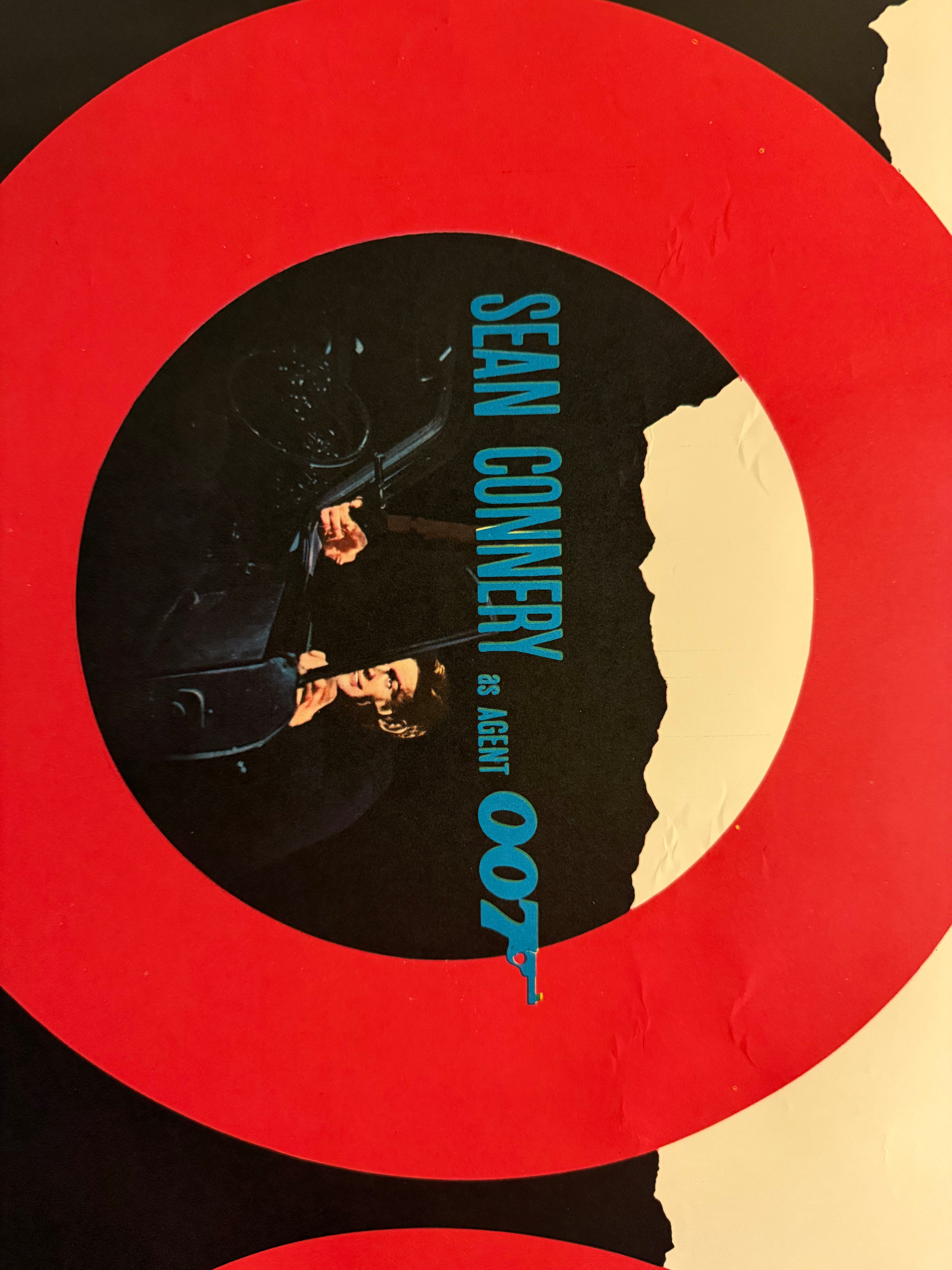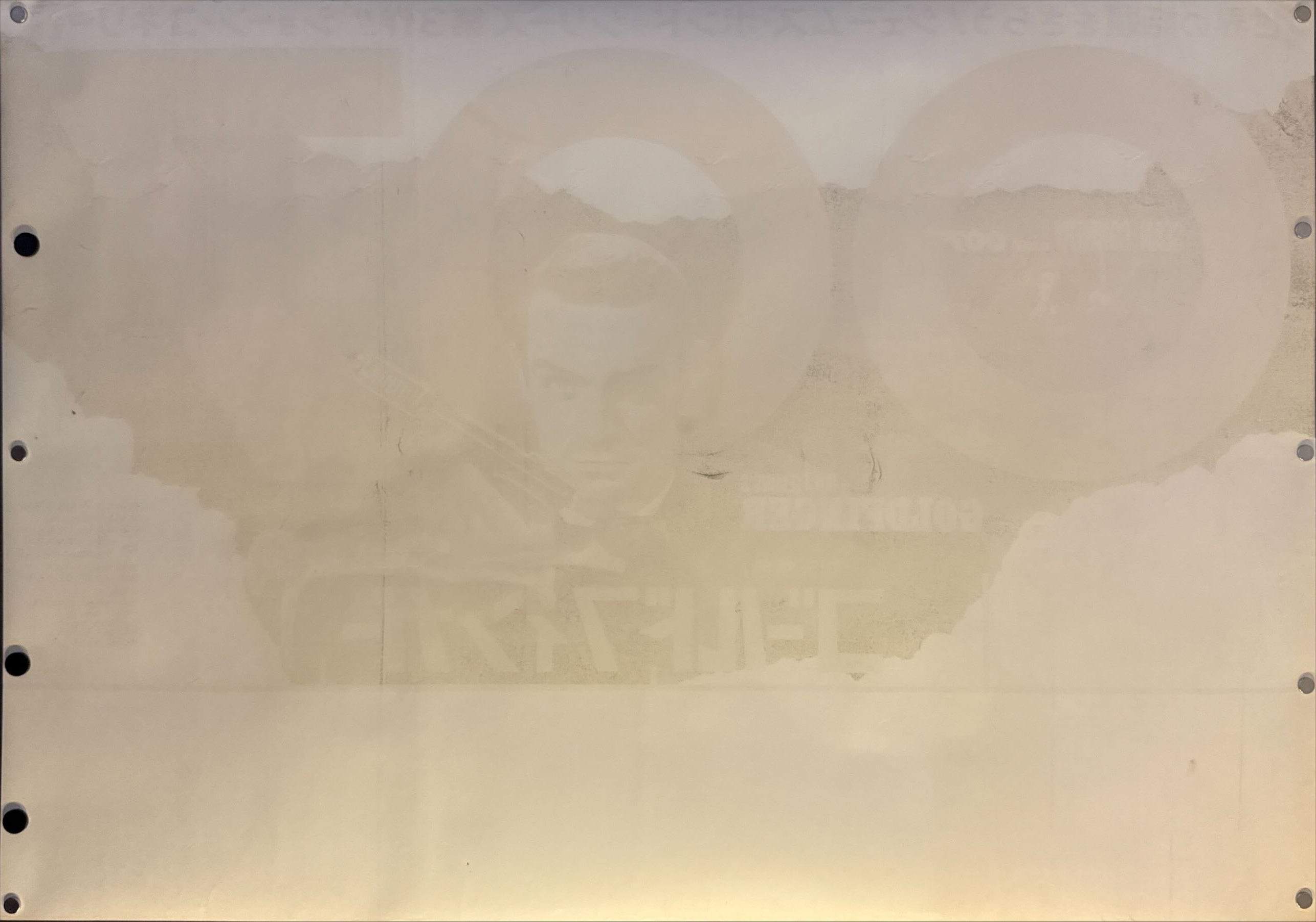 This scarce B1 carries a domestic‑market composition: graphic red “007” target rings on a torn‑black field, Connery’s tuxedoed Bond with Walther, the English/Japanese title stack, and the gold‑painted girl along the vertical band. The artwork is unique to the Japanese campaign and was issued without designer credit—typical for studio/agency work on 1960s UA Japan materials. Comparable first‑release Japanese posters are documented by major dealers and auction houses.