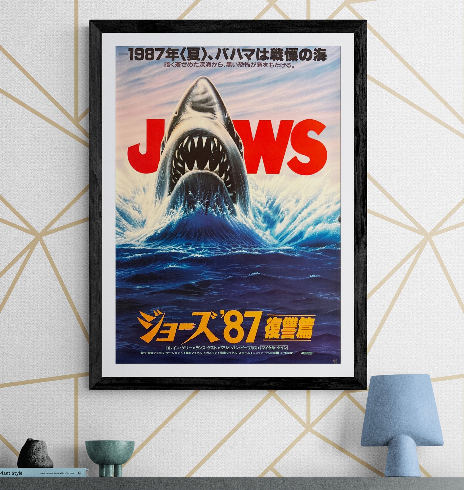 This is an original Japanese B2 theatrical poster printed in 1987 for the first Japanese release of Jaws: The Revenge (ジョーズ’87 復讐篇), the fourth entry in the Jaws franchise, directed by Joseph Sargent and starring Lorraine Gary and Michael Caine. Marketed in Japan with the bold “’87” rebrand, the film leans fully into late-1980s blockbuster spectacle—sunlit seas, dread from below, and the series’ most overt “revenge” hook.